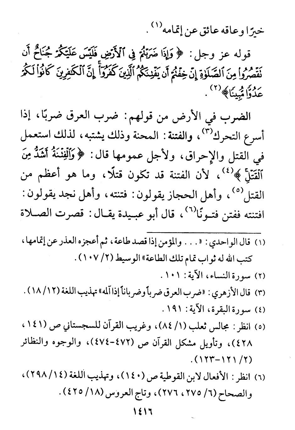 قوله عز وجل: (وَإِذَا ضَرَبْتُمْ فِي الْأَرْضِ فَلَيْسَ عَلَيْكُمْ جُنَاحٌ أَنْ تَقْصُرُوا مِنَ الصَّلَاةِ إِنْ خِفْتُمْ أَنْ يَفْتِنَكُمُ الَّذِينَ كَفَرُوا إِنَّ الْكَافِرِينَ كَانُوا لَكُمْ عَدُوًّا مُبِينًا (101)