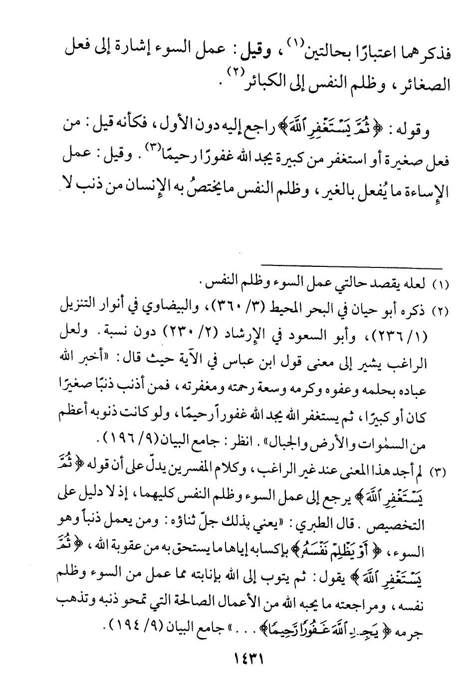 فكأنه قيل: من فعل صغيرة أو استغفر من كبيرة يَجِدِ اللَّهَ غَفُورًا رَحِيمًا. وقيل: عمل الإِساءة ما يُفعل بالغير، وظلم النفس ما يختصُ به الإِنسان من ذنب لا يتعداه.