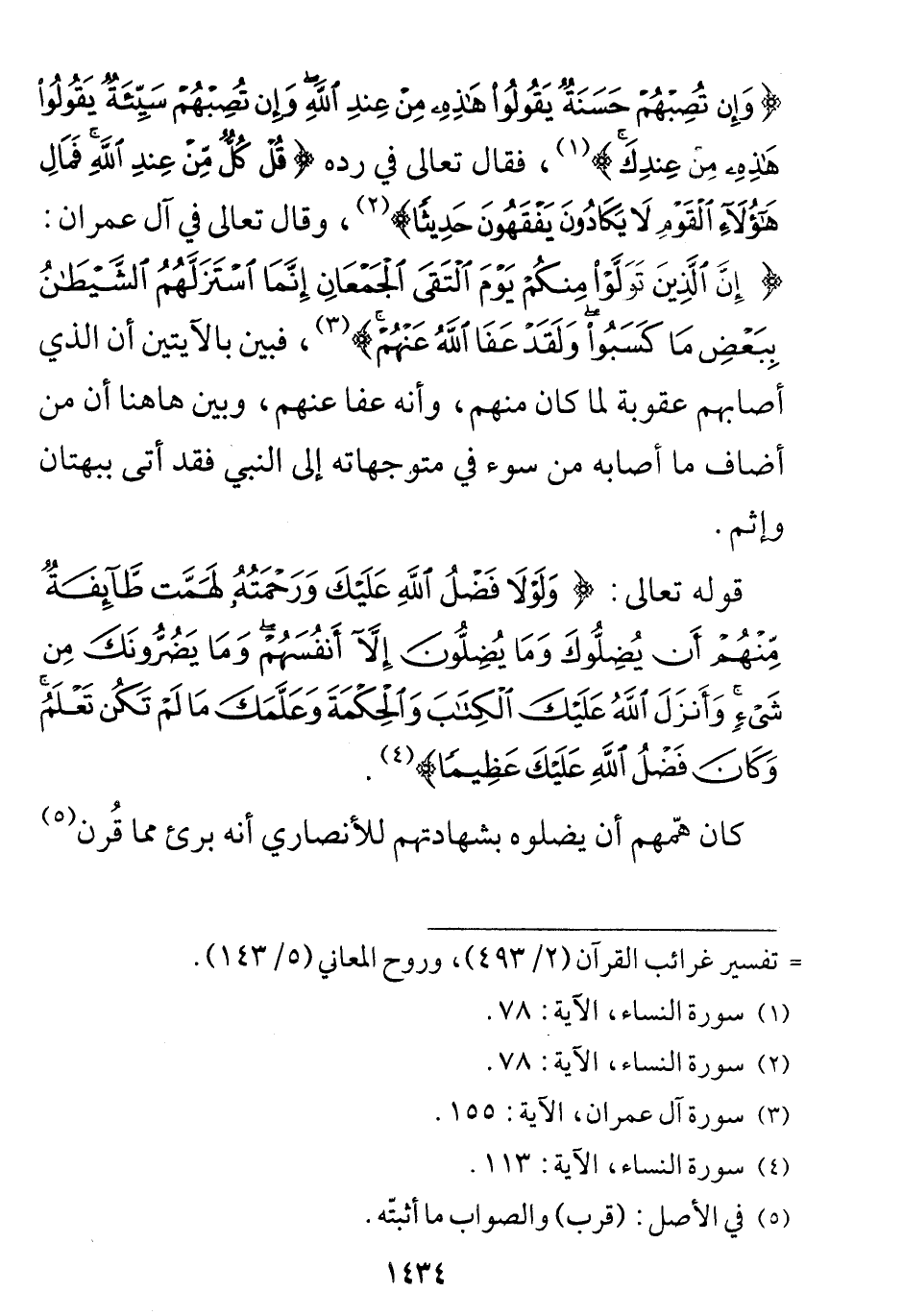 (وَإِنْ تُصِبْهُمْ حَسَنَةٌ يَقُولُوا هَذِهِ مِنْ عِنْدِ اللَّهِ وَإِنْ تُصِبْهُمْ سَيِّئَةٌ يَقُولُوا هَذِهِ مِنْ عِنْدِكَ)، فقال تعالى في رده (قُلْ كُلٌّ مِنْ عِنْدِ اللَّهِ فَمَالِ هَؤُلَاءِ الْقَوْمِ لَا يَكَادُونَ يَفْقَهُونَ حَدِيثًا).