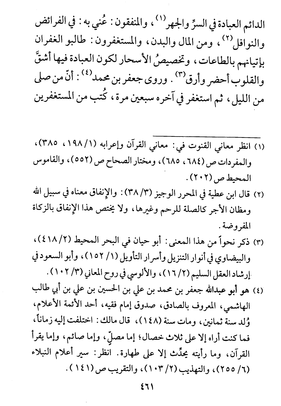 الدائم العبادة في السرِّ والجهر، والمنفقون: عُني به: في الفرائض