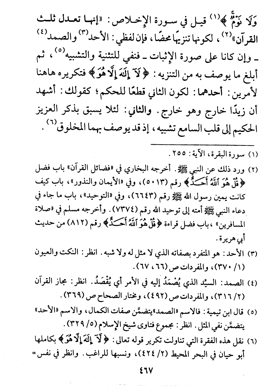 قيل في سورة الإِخلاص: "إنها تعدل ثلث القرآن "، لكونها تنزيهًا محضًا، فإن لفظي: الأحد والصمد وإن كانا على صورة الإِثبات - فنفي للتثنية والتشبيه)، ثم أبلغ ما يوصف به من التنزيه: (لَا إِلَهَ إِلَّا هُوَ) فتكريره هاهنا