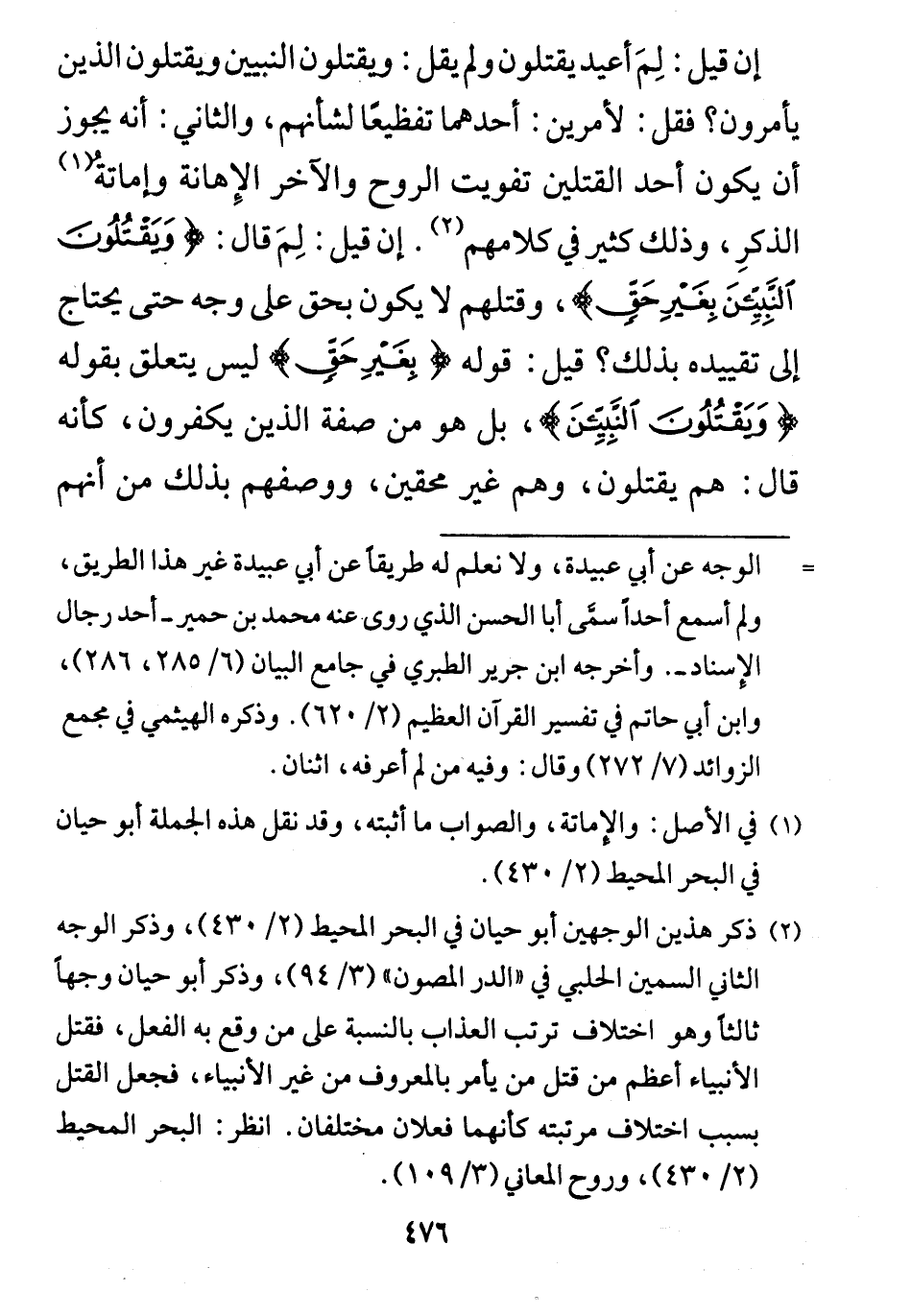 إن قيل: لِمَ قال: (وَيَقْتُلُونَ النَّبِيِّينَ بِغَيْرِ حَقٍّ)، وقتلهم لا يكون بحق على وجه حتى يحتاج إلى تقييده بذلك؟
