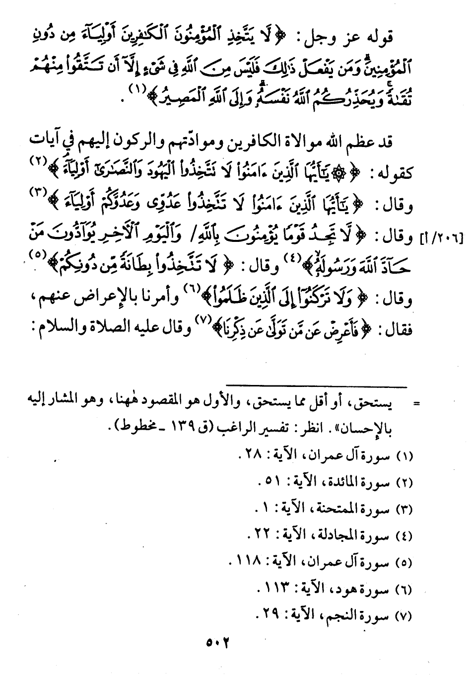 وقال: (لَا تَجِدُ قَوْمًا يُؤْمِنُونَ بِاللَّهِ وَالْيَوْمِ الْآخِرِ يُوَادُّونَ مَنْ حَادَّ اللَّهَ وَرَسُولَهُ) وقال: (لَا تَتَّخِذُوا بِطَانَةً مِنْ دُونِكُمْ).