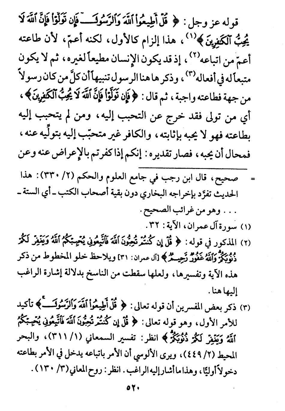هذا إلزام "كالأول، لكنه أعم، لأن طاعته أعمّ من اتباعه، إذ قد يكون الإنسان مطيعا لغيره، ثم لا يكون متبعا له في أفعاله، وذكر ها هنا الرسول تنبيها أن كل من كان رسولاً من جهة فطاعته واجبة، \ثم قال: (فَإِنْ تَوَلَّوْا فَإِنَّ اللَّهَ لَا يُحِبُّ الْكَافِرِينَ)، أي من تولى فقد خرج عن التحبب إليه، ومن لم يتحبب إليه بطاعته فهو لا يحبه بإثابته، والكافر غير متحبب إليه بتولِّيه عنه، فمحال أن يحبه، فصار تقديره: إنكم إذا كفرتم بالإعراض عنه وعن