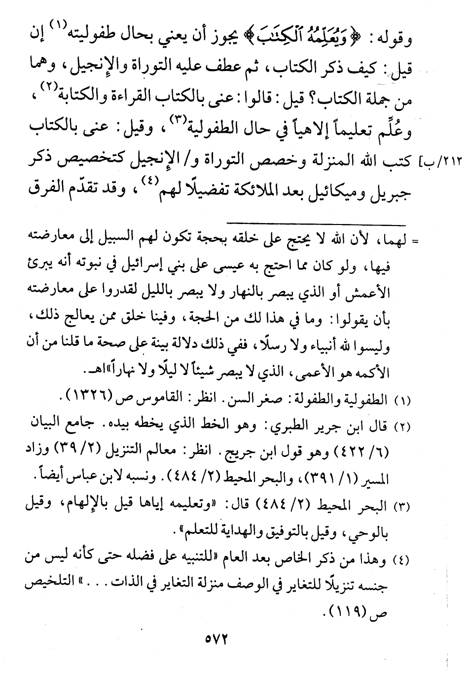قيل: قالوا: عنى بالكتاب القراءة والكتابة، وعُلِّم تعليماً إلاهيًّا في حال الطفولية، وقيل: عنى بالكتاب كتب الله المنزلة وخصص التوراة والإِنجيل كتخصيص ذكر جبريل وميكائيل بعد الملائكة تفضيلًا لهم، وقد تقدّم الفرق