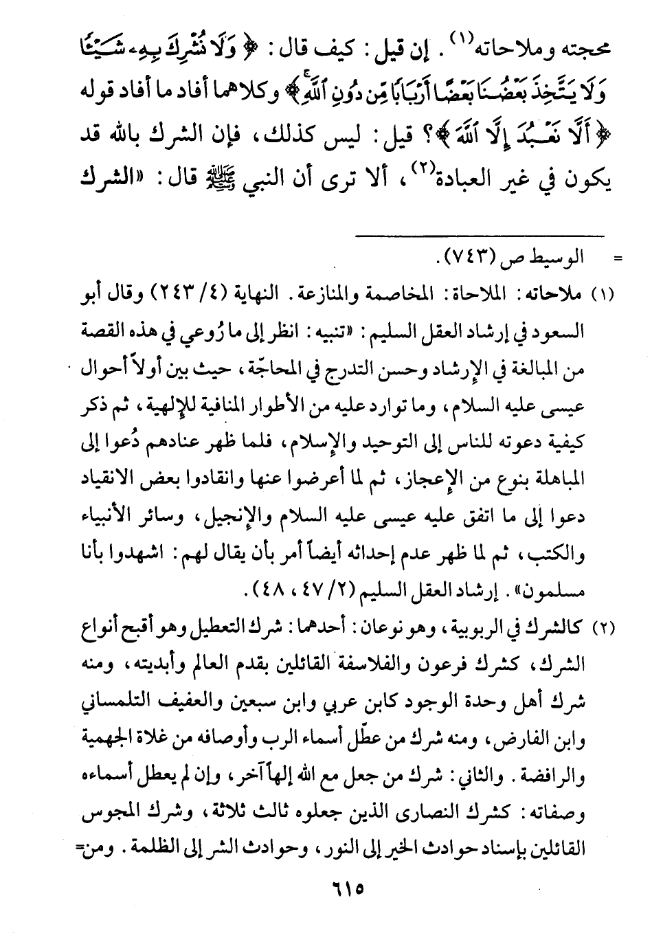 إن قيل: كيف قال: (وَلَا نُشْرِكَ بِهِ شَيْئًا وَلَا يَتَّخِذَ بَعْضُنَا بَعْضًا أَرْبَابًا مِنْ دُونِ اللَّهِ) وكلاهما أفاد ما أفاد قوله (أَلَّا نَعْبُدَ إِلَّا اللَّهَ)؟