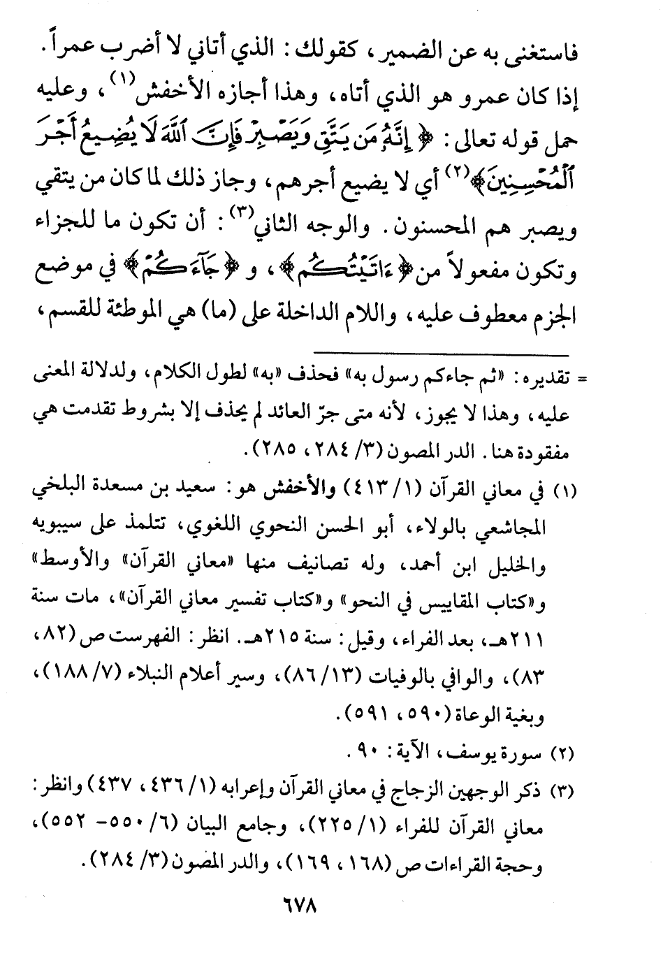 أي لا يضيع أجرهم، وجاز ذلك لما كان من يتقي ويصبر هم المحسنون. والوجه الثاني: أن تكون ما للجزاء وتكون مفعولا من (آتَيْتُكُمْ)، و (جَاءَكُمْ) في موضع الجزم معطوف عليه، واللام الداخلة على (ما) هي الموطئة للقسم،