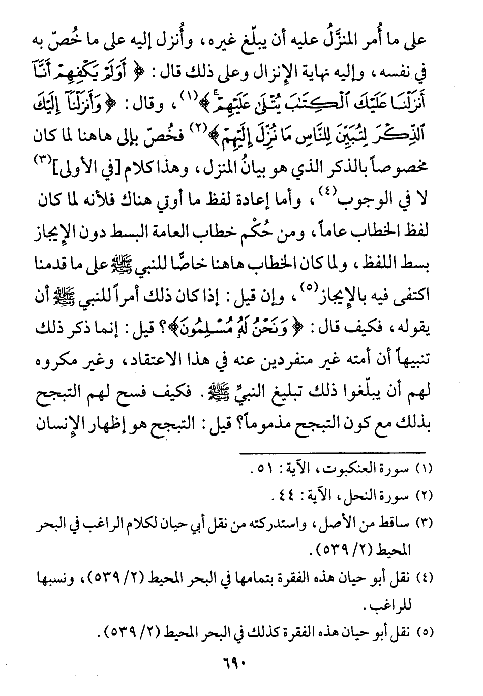 في نفسه، وإليه نهاية الإِنزال وعلى ذلك قال: (أَوَلَمْ يَكْفِهِمْ أَنَّا أَنْزَلْنَا عَلَيْكَ الْكِتَابَ يُتْلَى عَلَيْهِمْ)، وقال: (وَأَنْزَلْنَا إِلَيْكَ الذِّكْرَ لِتُبَيِّنَ لِلنَّاسِ مَا نُزِّلَ إِلَيْهِمْ) فخُصّ بإلى هاهنا لما كان مخصوصاً بالذكر الذي هو بيانُ المنزل، وهذا كلام أي الأولى، لا في الوجوب، وأما إعادة لفظ (ما أوتي) هناك فلأنه لما كان لفظ الخطاب عاماً، ومن حُكْم خطاب العامة البسط دون الإِيجاز