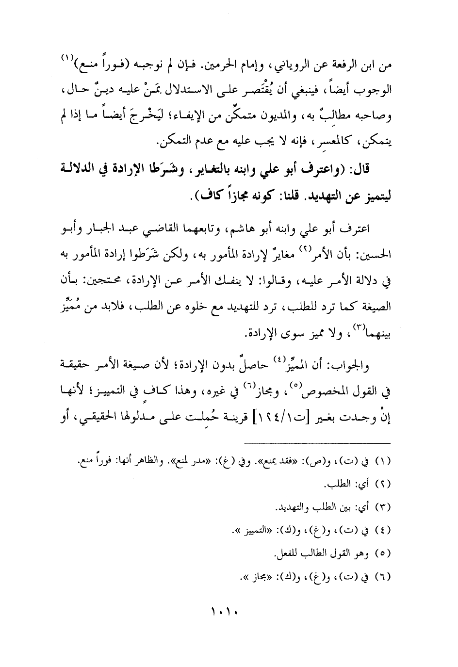 قال: (واعترف أبو علي وابنه بالتغاير، وشَرَطا الإرادة في الدلالة ليتميز عن التهديد. قلنا: كونه مجازًا كاف).