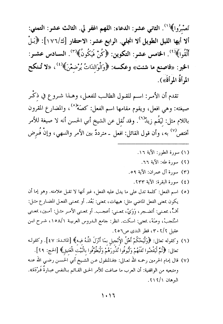 تَصْبِرُوا} (¬١). الثاني عشر: الدعاء: اللهم اغفر لي. الثالث عشر: التمني: ألا أيها الليل الطويل ألا انجلي. الرابع عشر: الاحتقار: {بَلْ أَلْقُوا} (¬٢). الخامس عشر: التكوين: {كُنْ فَيَكُونُ} (¬٣). السادس عشر: الخبر: "فاصنع ما شئت" وعكسه: {وَالْوَالِدَاتُ يُرْضِعْنَ} (¬٤)، "لا تُنكح المرأةُ المرأةَ").