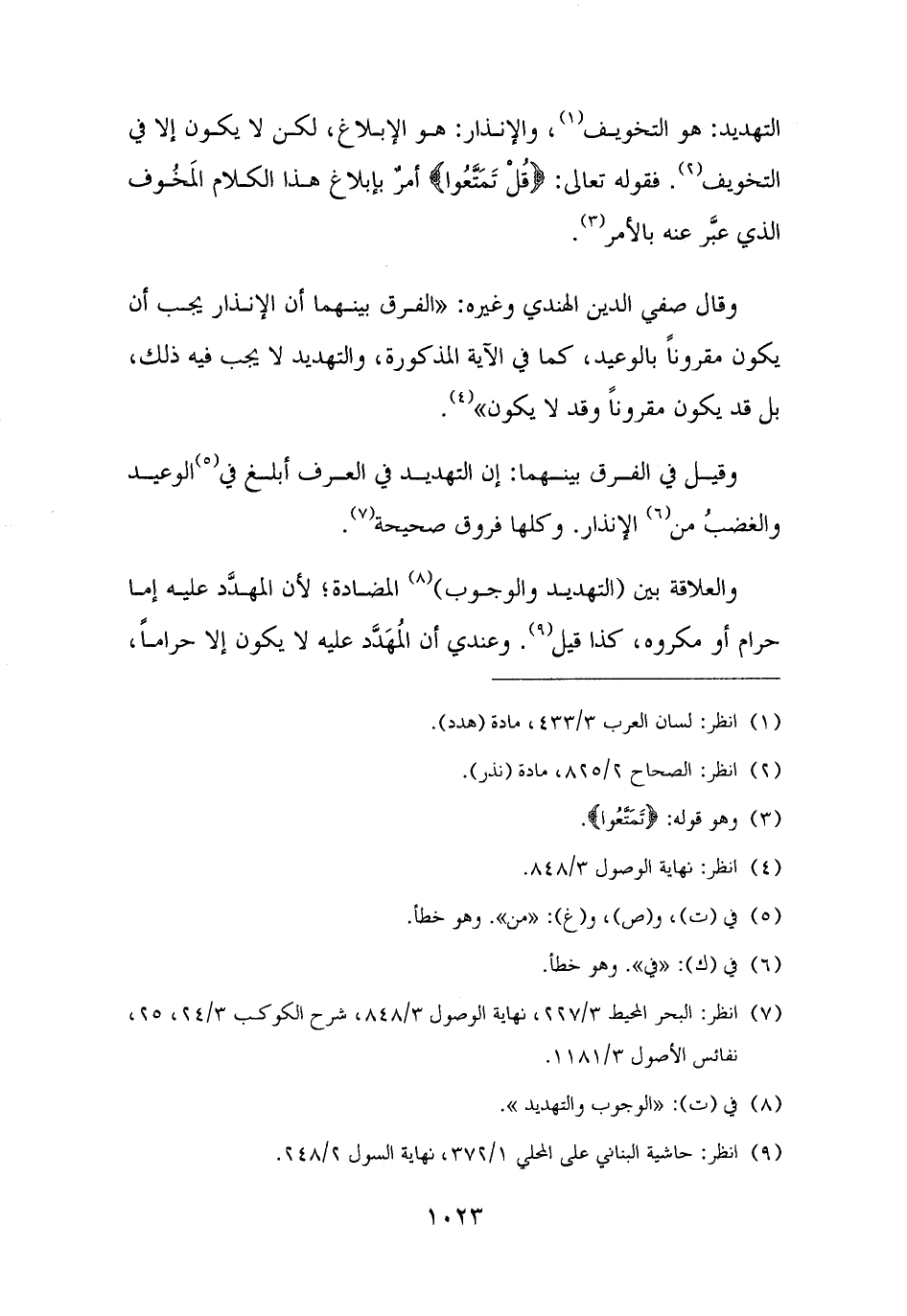 وقال صفي الدين الهندي وغيره: "الفرق بينهما أن الإنذار يجب أن يكون مقرونًا بالوعيد، كما في الآية المذكورة، والتهديد لا يجب فيه ذلك، بل قد يكون مقرونًا وقد لا يكون" (¬٤).