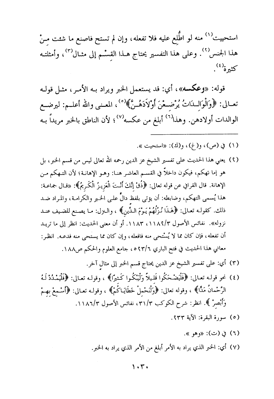 (¬٢) يعني هذا الحديث على تفسير الشيخ عز الدين رحمه الله تعالى ليس من قسم الخبر، بل هو إما تهكم، فيكون داخلًا في القسم العاشر هنا: وهو الإهانة؛ لأن التهكم من الإهانة. قال القرافي عن قوله تعالى: {ذُقْ إِنَّكَ أَنْتَ الْعَزِيزُ الْكَرِيمُ}: "قال جماعة: هذا يُسمى التهكم، وضابطه: أن يؤتى بلفظٍ دالٍّ على الخير والكرامة، والمراد ضد ذلك. كقوله تعالى: {هَذَا نُزُلُهُمْ يَوْمَ الدِّينِ}، والنزل: ما يصنع للضيف عند نزوله". نفائس الأصول ٣/ ١١٨٢، ١١٨٣. أو أن معنى الحديث: انظر إلى ما تريد أن تفعله، فإن كان مما لا يُسْتحى منه فافعله، وإن كان مما يستحى منه فدعه. انظر: معاني هذا الحديث في فتح الباري ٦/ ٥٢٣، جامع العلوم والحكم ص ١٨٨.