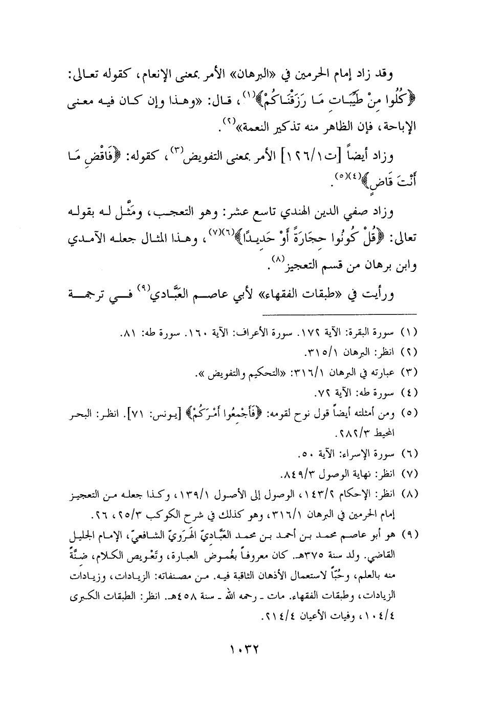 وزاد صفي الدين الهندي تاسع عشر: وهو التعجب، ومَثَّل له بقوله تعالى: {قُلْ كُونُوا حِجَارَةً أَوْ حَدِيدًا} (¬٦) (¬٧)، وهذا المثال جعله الآمدي وابن برهان من قسم التعجيز (¬٨).