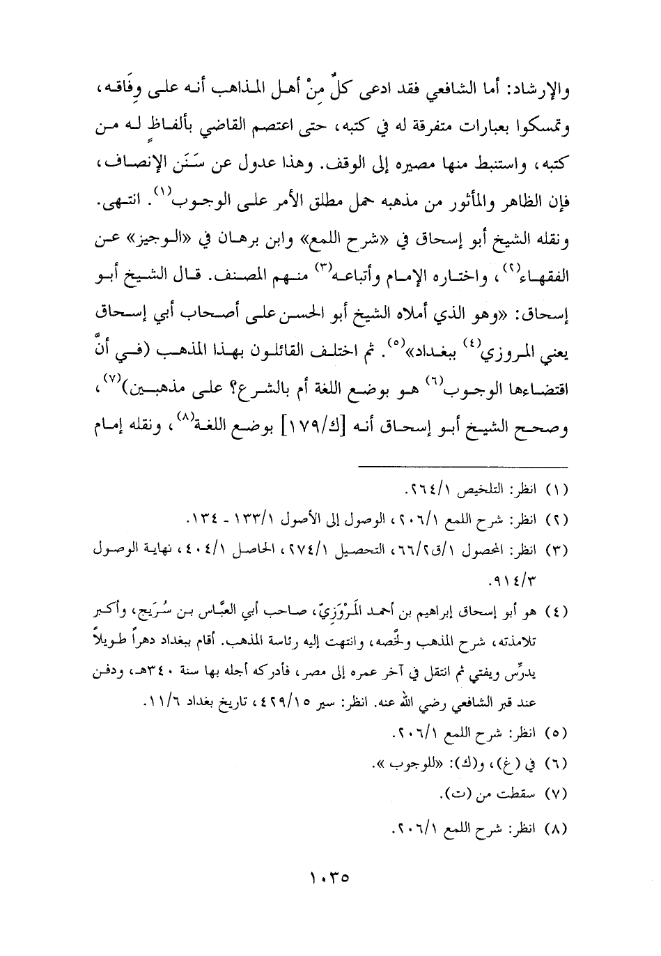 والإرشاد: أما الشافعي فقد ادعى كلٌ مِنْ أهل المذاهب أنه على وِفَاقه، وتمسكوا بعبارات متفرقة له في كتبه، حتى اعتصم القاضي بألفاظٍ له من كتبه، واستنبط منها مصيره إلى الوقف. وهذا عدول عن سَنَن الإنصاف، فإن الظاهر والمأثور من مذهبه حمل مطلق الأمر على الوجوب (¬١). انتهى. ونقله الشيخ أبو إسحاق في "شرح اللمع" وابن برهان في "الوجيز" عن الفقهاء (¬٢)، واختاره الإمام وأتباعه (¬٣) منهم المصنف. قال الشيخ أبو إسحاق: "وهو الذي أملاه الشيخ أبو الحسن على أصحاب أبي إسحاق يعني المروزي (¬٤) ببغداد" (¬٥). ثم اختلف القائلون بهذا المذهب (في أنَّ اقتضاءها الوجوب (¬٦) هو بوضع اللغة أم بالشرع؟ على مذهبين) (¬٧)، وصحح الشيخ أبو إسحاق أنه بوضع اللغة (¬٨)، ونقله إمام