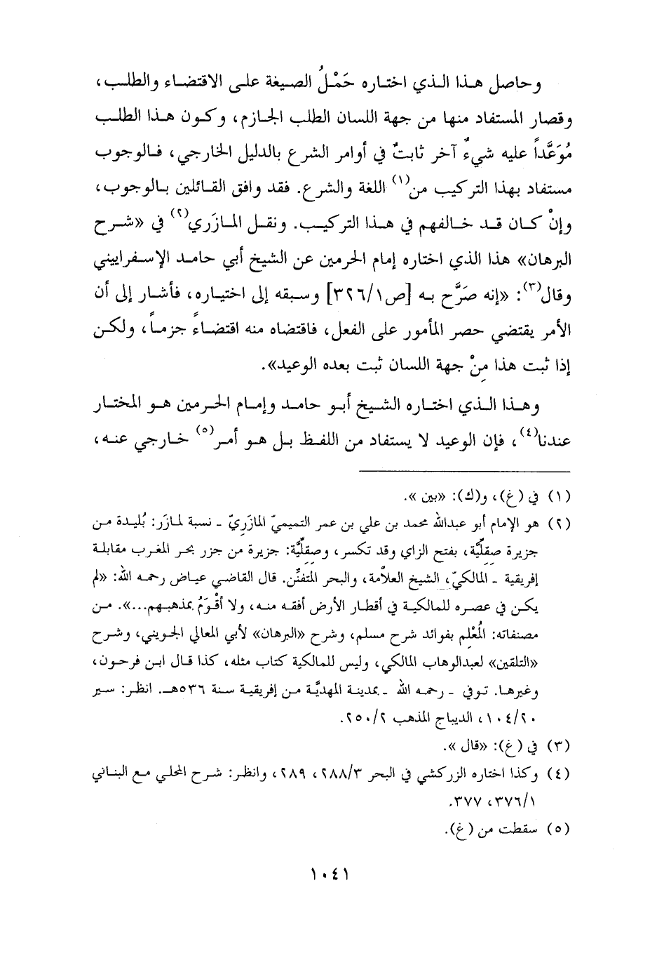 وحاصل هذا الذي اختاره حَمْلُ الصيغة على الاقتضاء والطلب، وقصار المستفاد منها من جهة اللسان الطلب الجازم، وكون هذا الطلب مُوَعَّدًا عليه شيءٌ آخر ثابتٌ في أوامر الشرع بالدليل الخارجي، فالوجوب مستفاد بهذا التركيب من (¬١) اللغة والشرع. فقد وافق القائلين بالوجوب، وإنْ كان قد خالفهم في هذا التركيب. ونقل المازَري (¬٢) في "شرح البرهان" هذا الذي اختاره إمام الحرمين عن الشيخ أبي حامد الإسفراييني وقال (¬٣): "إنه صَرَّح به وسبقه إلى اختياره، فأشار إلى أن الأمر يقتضي حصر المأمور على الفعل، فاقتضاه منه اقتضاءً جزمًا، ولكن إذا ثبت هذا مِنْ جهة اللسان ثبت بعده الوعيد".