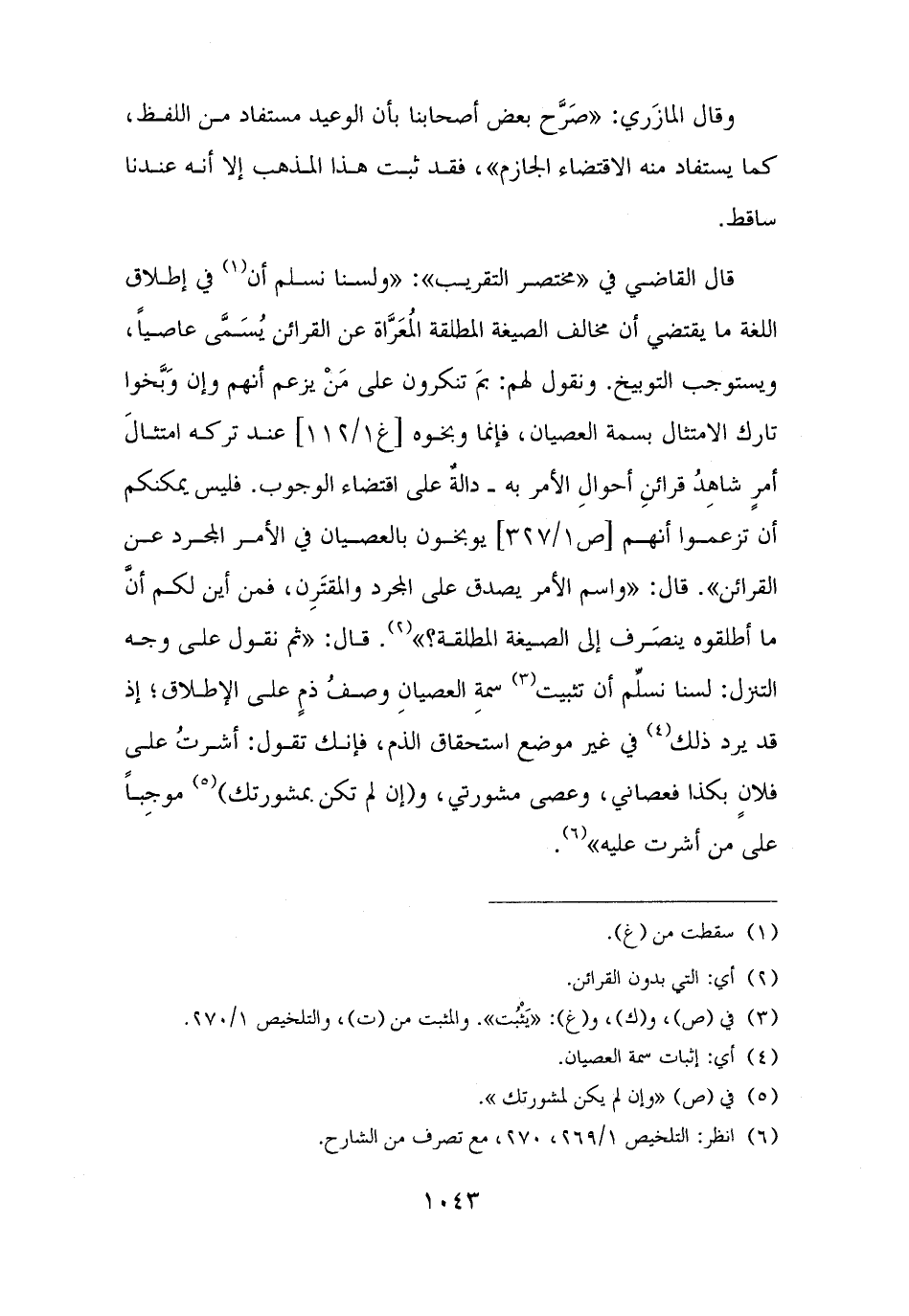 قال القاضي في "مختصر التقريب": "ولسنا نسلم أن (¬١) في إطلاق اللغة ما يقتضي أن مخالف الصيغة المطلقة المُعَرَّاة عن القرائن يُسَمَّى عاصيًا، ويستوجب التوبيخ. ونقول لهم: بمَ تنكرون على مَنْ يزعم أنهم وإن وَبَّخوا تارك الامتثال بسمة العصيان، فإنما وبخوه عند تركه امتثالَ أمرٍ شاهِدُ قرائنِ أحوالِ الأمر به - دالةٌ على اقتضاء الوجوب. فليس يمكنكم أن تزعموا أنهم يوبخون بالعصيان في الأمر المجرد عن القرائن". قال: "واسم الأمر يصدق على المجرد والمقتَرِن، فمن أين لكم أنَّ ما أطلقوه ينصَرف إلى الصيغة المطلقة؟ " (¬٢). قال: "ثم نقول على وجه التنزل: لسنا نسلِّم أن تثبيت (¬٣) سمةِ العصيانِ وصفُ ذمٍ على الإطلاق؛ إذ قد يرد ذلك (¬٤) في غير موضع استحقاق الذم، فإنك تقول: أشرتُ على فلانٍ بكذا فعصاني، وعصى مشورتي، و (إن لم تكن بمشورتك) (¬٥) موجِبًا على من أشرت عليه" (¬٦).