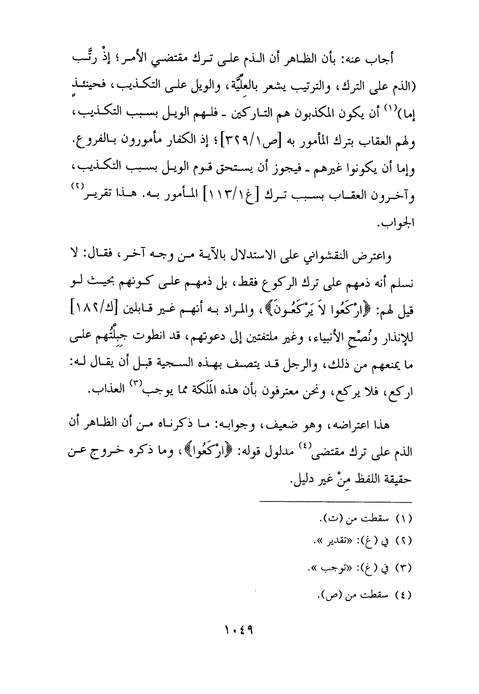 واعترض النقشواني على الاستدلال بالآية من وجه آخر، فقال: لا نسلم أنه ذمهم على ترك الركوع فقط، بل ذمهم على كونهم بحيث لو قيل لهم: {ارْكَعُوا لَا يَرْكَعُونَ}، والمراد به أنهم غير قابلين للإنذار ونُصْحِ الأنبياء، وغير ملتفتين إلى دعوتهم، قد انطوت جِبِلَّتُهم على ما يمنعهم من ذلك، والرجل قد يتصف بهذه السجية قبل أن يقال له: اركع، فلا يركع، ونحن معترفون بأن هذه المَلَكة مما يوجب (¬٣) العذاب.