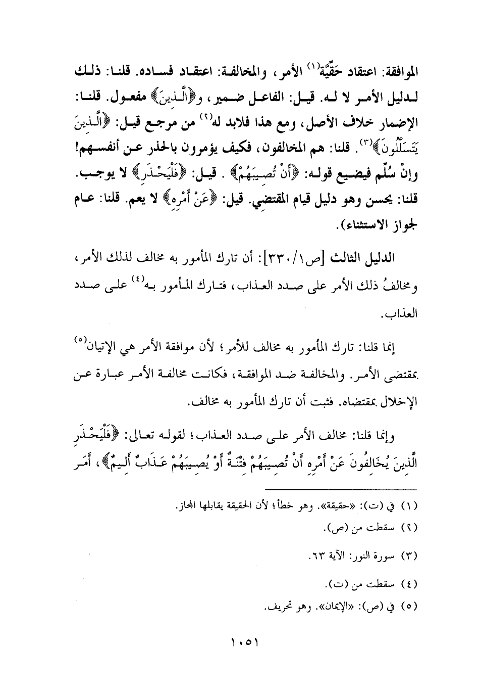 وإنما قلنا: مخالف الأمر على صدد العذاب؛ لقوله تعالى: {فَلْيَحْذَرِ الَّذِينَ يُخَالِفُونَ عَنْ أَمْرِهِ أَنْ تُصِيبَهُمْ فِتْنَةٌ أَوْ يُصِيبَهُمْ عَذَابٌ أَلِيمٌ}، أَمَر
