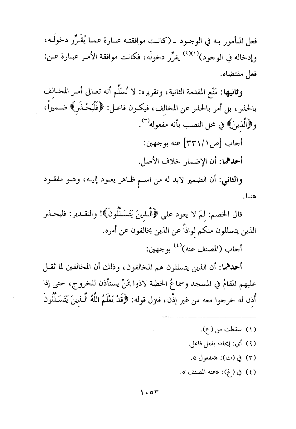 وثانيها: مَنْع المقدمة الثانية، وتقريره: لا نُسَلِّم أنه تعالى أمر المخالِف بالحذر، بل أمر بالحذر عن المخالِف، فيكون فاعل: {فَلْيَحْذَرِ} ضميرًا، و {الَّذِينَ} في محل النصب بأنه مفعوله (¬٣).