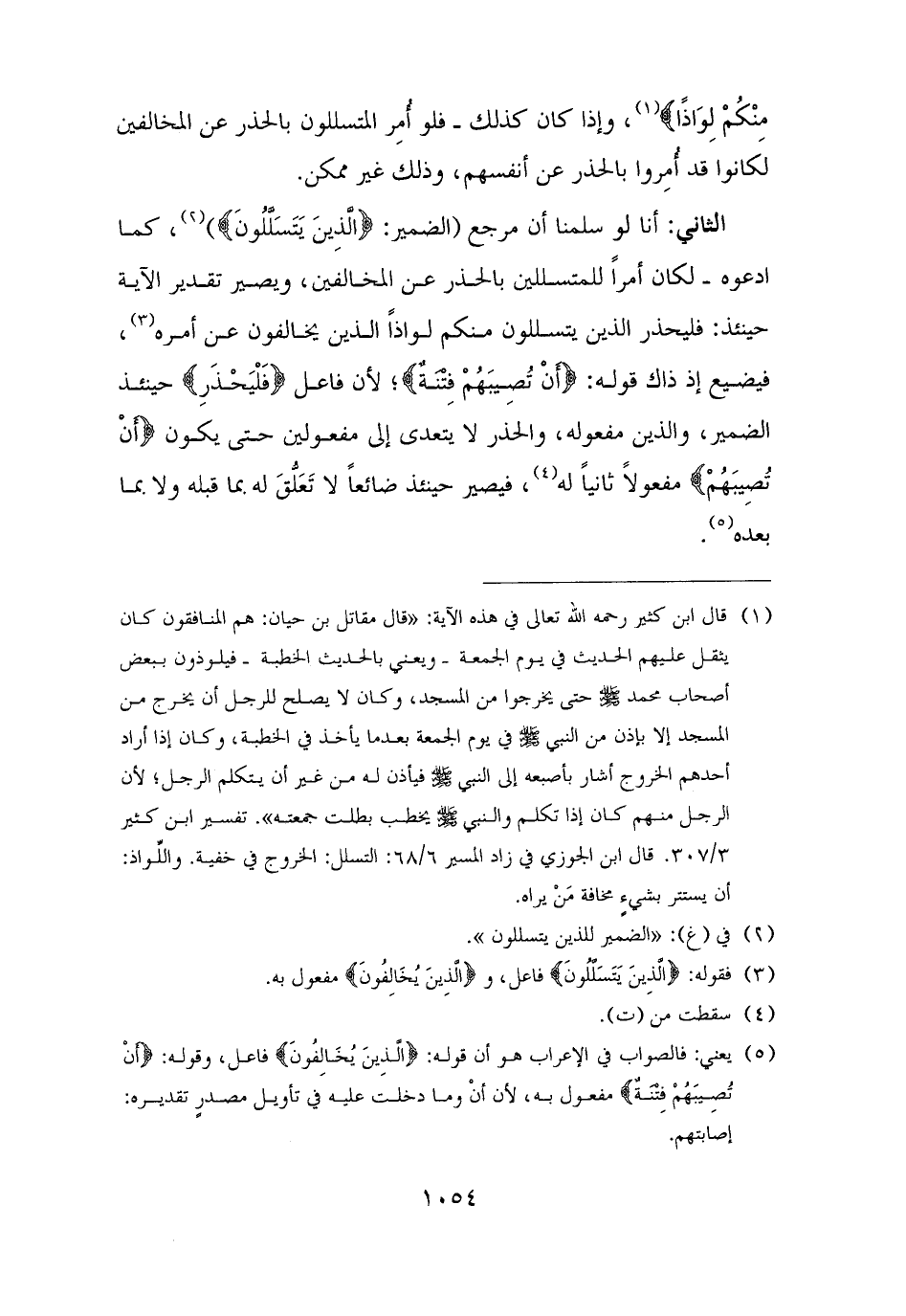 الثاني: أنا لو سلمنا أن مرجع (الضمير: {الَّذِينَ يَتَسَلَّلُونَ}) (¬٢)، كما ادعوه - لكان أمرًا للمتسللين بالحذر عن المخالفين، ويصير تقدير الآية حينئذ: فليحذر الذين يتسللون منكم لواذًا الذين يخالفون عن أمره (¬٣)، فيضيع إذ ذاك قوله: {أَنْ تُصِيبَهُمْ فِتْنَةٌ}؛ لأن فاعل {فَلْيَحْذَرِ} حينئذ الضمير، والذين مفعوله، والحذر لا يتعدى إلى مفعولين حتى يكون {أَنْ تُصِيبَهُمْ} مفعولًا ثانيًا له (¬٤)، فيصير حينئذ ضائعًا لا تَعَلُّقَ له بما قبله ولا بما بعده (¬٥).