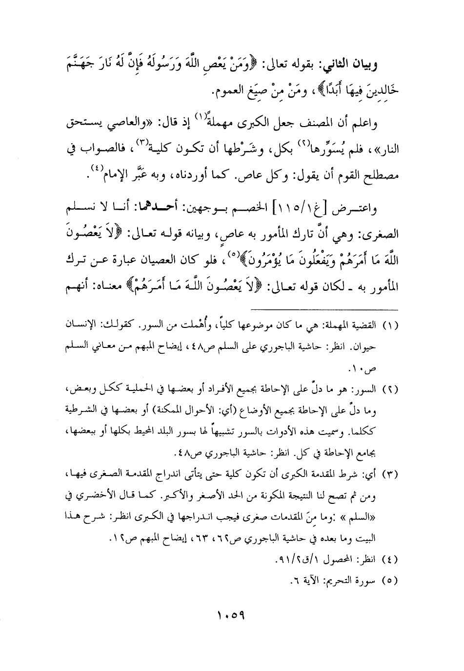 واعلم أن المصنف جعل الكبرى مهملةً (¬١) إذ قال: "والعاصي يستحق النار"، فلم يُسَوِّرها (¬٢) بكل، وشَرْطها أن تكون كلية (¬٣)، فالصواب في مصطلح القوم أن يقول: وكل عاص. كما أوردناه، وبه عَبَّر الإمام (¬٤).
