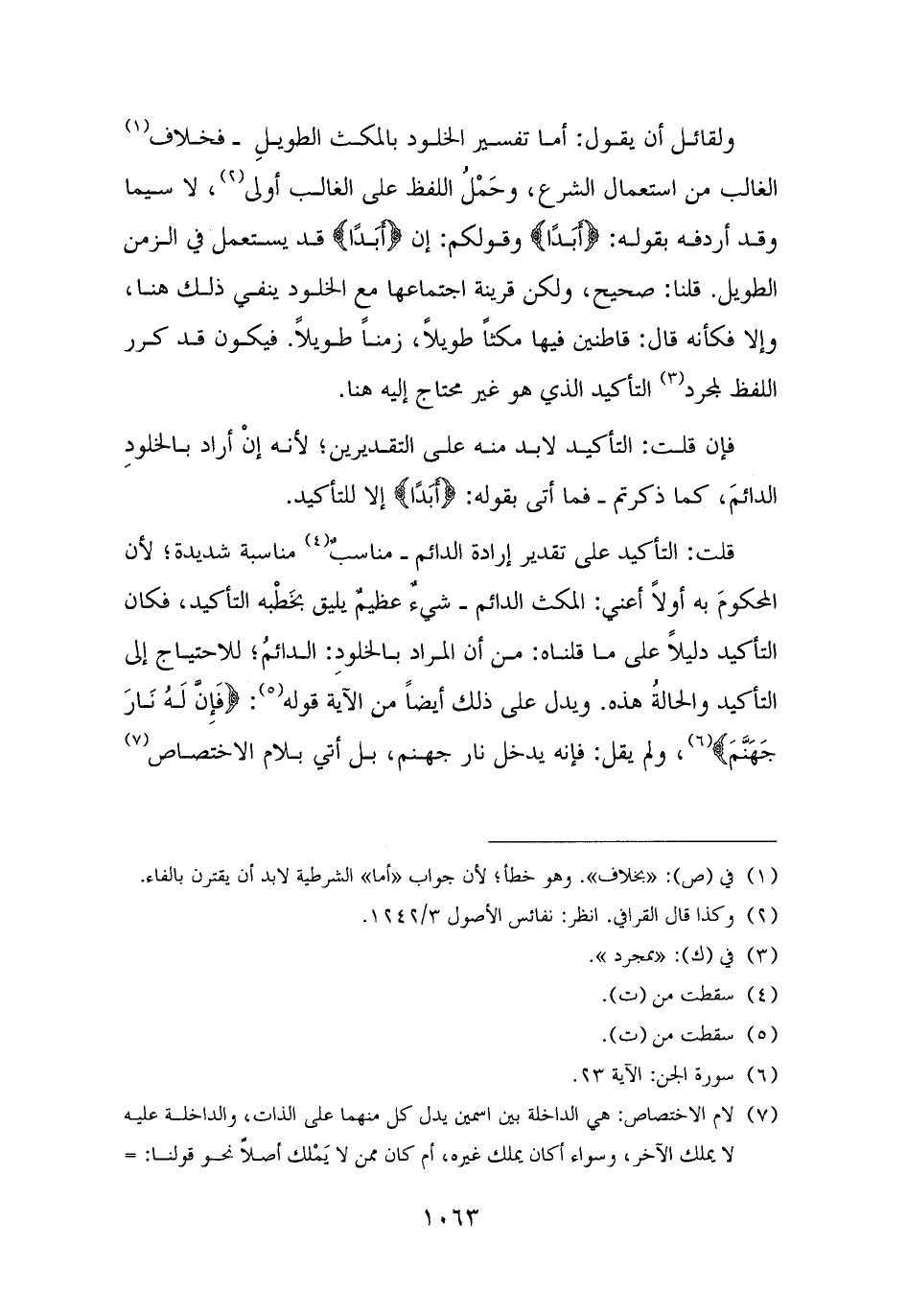 ولقائل أن يقول: أما تفسير الخلود بالمكث الطويلِ - فخلاف (¬١) الغالب من استعمال الشرع، وحَمْلُ اللفظ على الغالب أولى (¬٢)، لا سيما وقد أردفه بقوله: {أَبَدًا} وقولكم: إن {أَبَدًا} قد يستعمل في الزمن الطويل. قلنا: صحيح، ولكن قرينة اجتماعها معِ الخلود ينفي ذلك هنا، وإلا فكأنه قال: قاطنين فيها مكثًا طويلًا، زمنًا طويلًا. فيكون قد كرر اللفظ لمجرد (¬٣) التأكيد الذي هو غير محتاج إليه هنا.