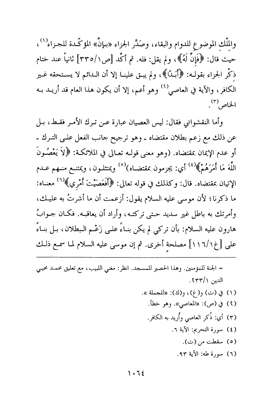 وأما النقشواني فقال: ليس العصيان عبارة عن ترك الأمر فقط، بل عن ذلك مع زعم بطلان مقتضاه - وهو ترجيح جانب الفعل على الترك - أو عدم الإيمان بمقتضاه. (وهو معنى قوله تعالى في الملائكة: {لَا يَعْصُونَ اللَّهَ مَا أَمَرَهُمْ} (¬٤) أي: يجزمون بمقتضاه) (¬٥) ويمتثلون، ويمتنع منهم عدم الإتيان بمقتضاه. قال: وكذلك في قوله تعالى: {أَفَعَصَيْتَ أَمْرِي} (¬٦) معناه: ما ذكرنا؛ لأن موسى عليه السلام يقول: أزعمت أن ما أشرتُ به عليك، وأمرتك به باطل غير سديد حتى تركته، وأراد أن يعاقبه. فكان جوابُ هارون عليه السلام: بأن تركي لم يكن بناءً على زَعْم البطلان، بل بناءً على مصلحةٍ أخرى. ثم إن موسى عليه السلام لما سمع ذلك