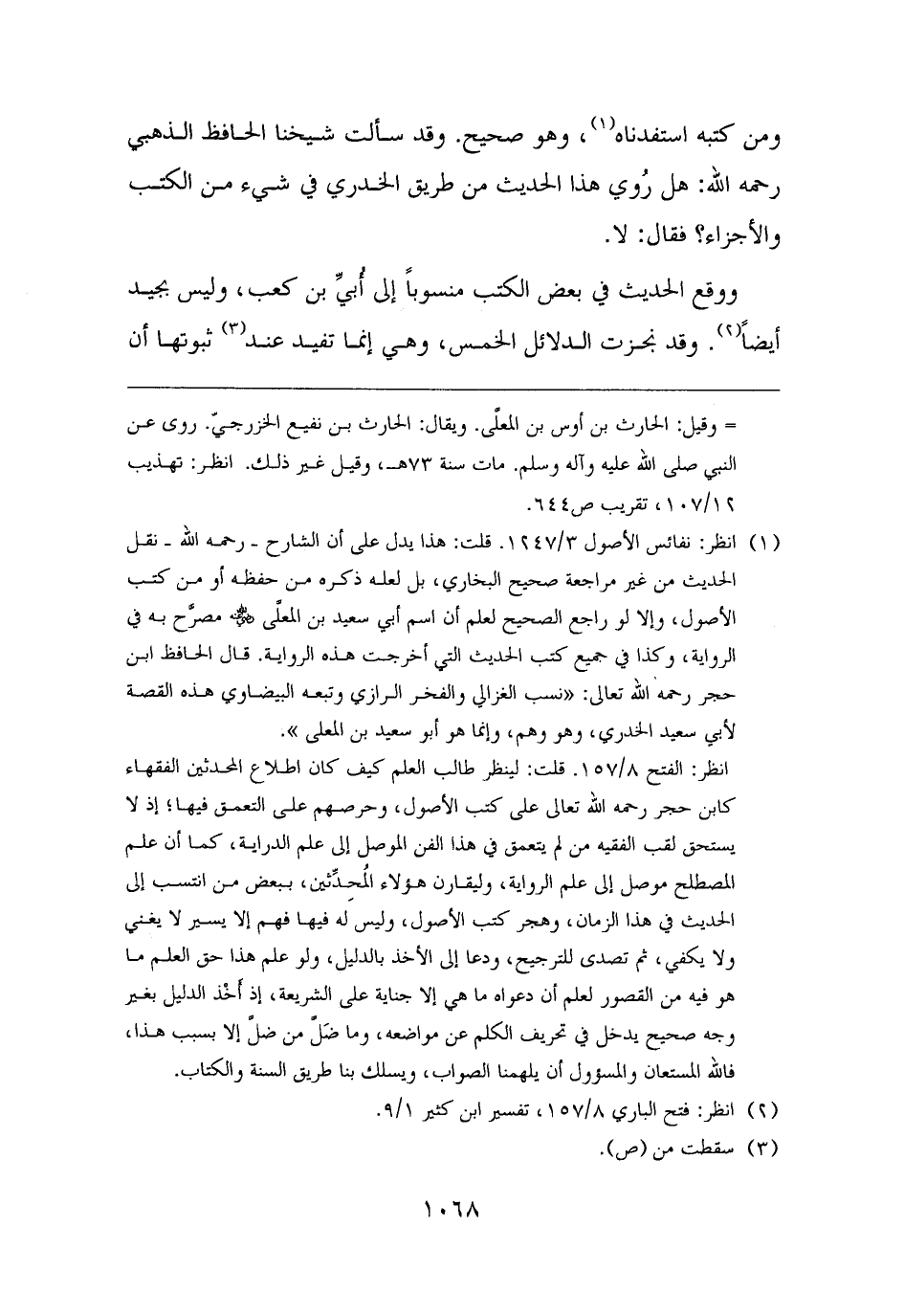 انظر: الفتح ٨/ ١٥٧. قلت: لينظر طالب العلم كيف كان اطلاع المحدثين الفقهاء كابن حجر رحمه الله تعالى على كتب الأصول، وحرصهم على التعمق فيها؛ إذ لا يستحق لقب الفقيه من لم يتعمق في هذا الفن الوصل إلى علم الدراية، كما أن علم المصطلح موصل إلى علم الرواية, وليقارن هؤلاء المُحدِّثين، ببعض من انتسب إلى الحديث في هذا الزمان، وهجر كتب الأصول، وليس له فيها فهم إلا يسير لا يغني ولا يكفي، ثم تصدى للترجيح، ودعا إلى الأخذ بالدليل، ولو علم هذا حق العلم ما هو فيه من القصور لعلم أن دعواه ما هي إلا جناية على الشريعة، إذ أَخْذ الدليل بغير وجه صحيح يدخل في تحريف الكلم عن مواضعه، وما ضَلَّ من ضلَّ إلا بسبب هذا، فالله المستعان والمسؤول أن يلهمنا الصواب، ويسلك بنا طريق السنة والكتاب.