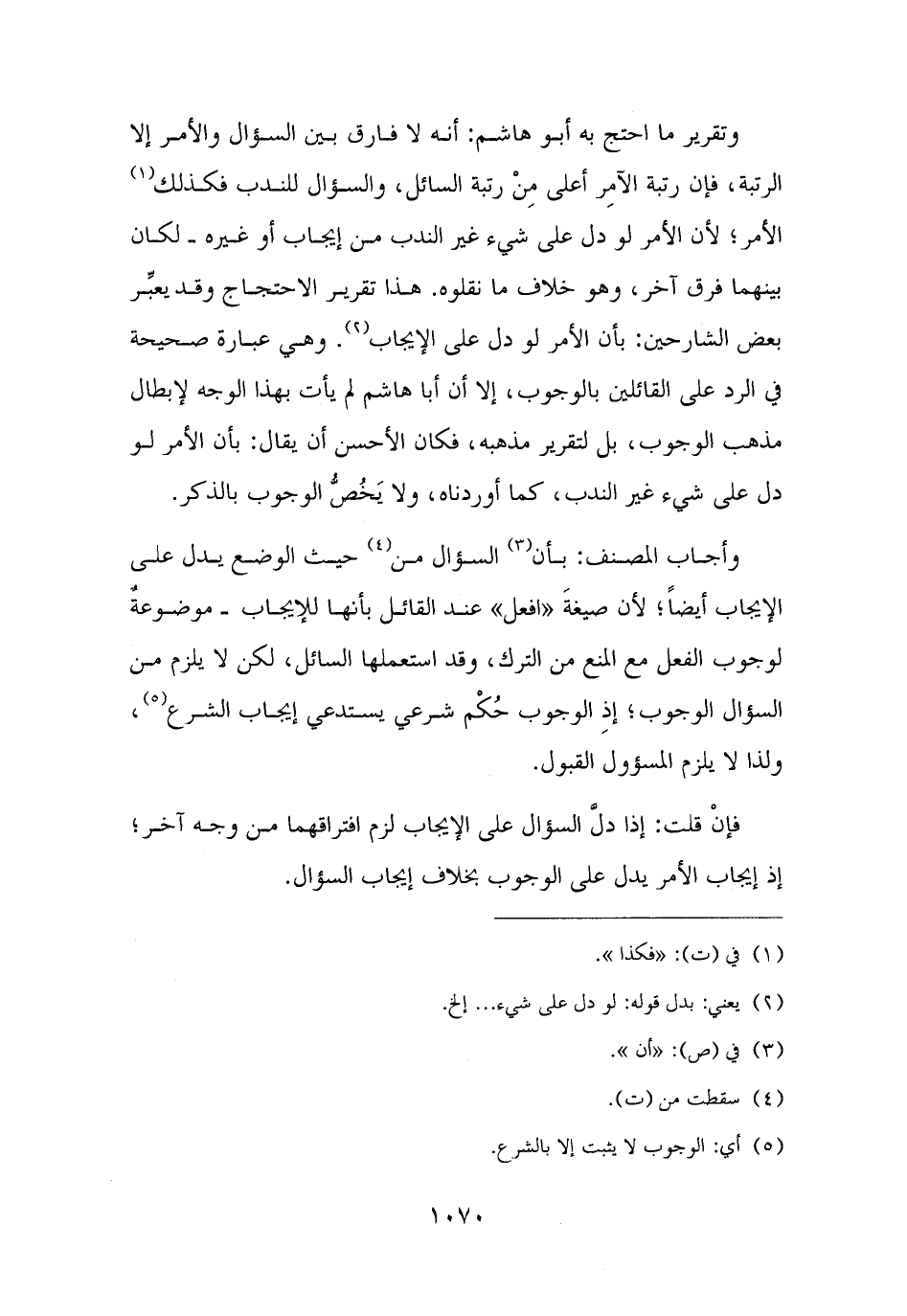 وتقرير ما احتج به أبو هاشم: أنه لا فارق بين السؤال والأمر إلا الرتبة، فإن رتبة الآمِر أعلى مِنْ رتبة السائل، والسؤال للندب فكذلك (¬١) الأمر؛ لأن الأمر لو دل على شيء غير الندب من إيجاب أو غيره - لكان بينهما فرقا آخر، وهو خلاف ما نقلوه. هذا تقرير الاحتجاج وقد يعبِّر بعض الشارحين: بأن الأمر لو دل على الإيجاب (¬٢). وهي عبارة صحيحة في الرد على القائلين بالوجوب، إلا أن أبا هاشم لم يأت بهذا الوجه لإبطال مذهب الوجوب، بل لتقرير مذهبه، فكان الأحسن أن يقال: بأن الأمر لو دل على شيء غير الندب، كما أوردناه، ولا يَخُصُّ الوجوب بالذكر.