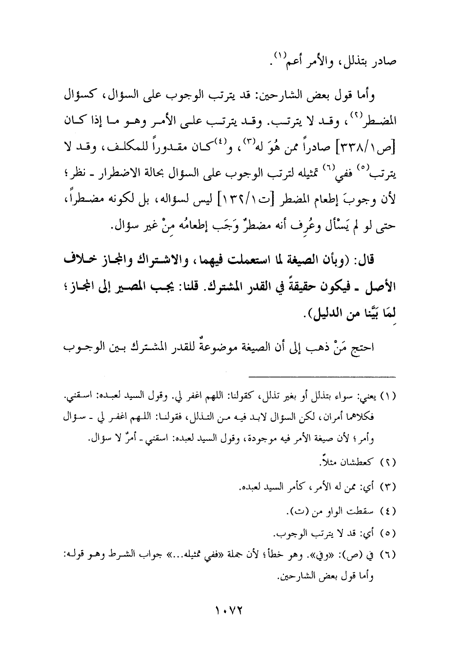 وأما قول بعض الشارحين: قد يترتب الوجوب على السؤال، كسؤال المضطر (¬٢)، وقد لا يترتب. وقد يترتب على الأمر وهو ما إذا كان صادرًا ممن هُوَ له (¬٣)، و (¬٤) كان مقدورًا للمكلف، وقد لا يترتب (¬٥) ففي (¬٦) تمثيله لترتب الوجوب على السؤال بحالة الاضطرار - نظر؛ لأن وجوبَ إطعام المضطر ليس لسؤاله، بل لكونه مضطرًا، حتى لو لم يَسْأل وعُرِف أنه مضطرٌ وَجَب إطعامُه مِنْ غير سؤال.