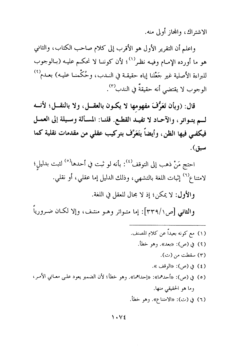 واعلم أن التقرير الأول هو الأقرب إلى كلام صاحب الكتاب، والثاني هو ما أورده الإمام وفيه نظر (¬١)؛ لأن كوننا لا نحكم عليه (بالوجوب للبراءة الأصلية غير جَعْلنا إياه حقيقة في الندب، وحُكْمنا عليه) بعدم (¬٢) الوجوب لا يقتضي أنه حقيقةٌ في الندب (¬٣).