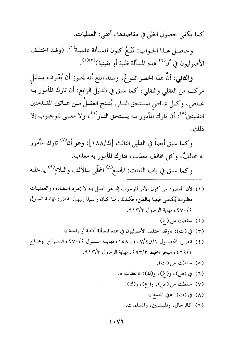 وحاصل هذا الجواب: مَنْعُ كون المسألة علمية (¬١). (وقد اختلف الأصوليون في أن (¬٢) هذه المسألة ظنية أو يقينية) (¬٣) (¬٤).