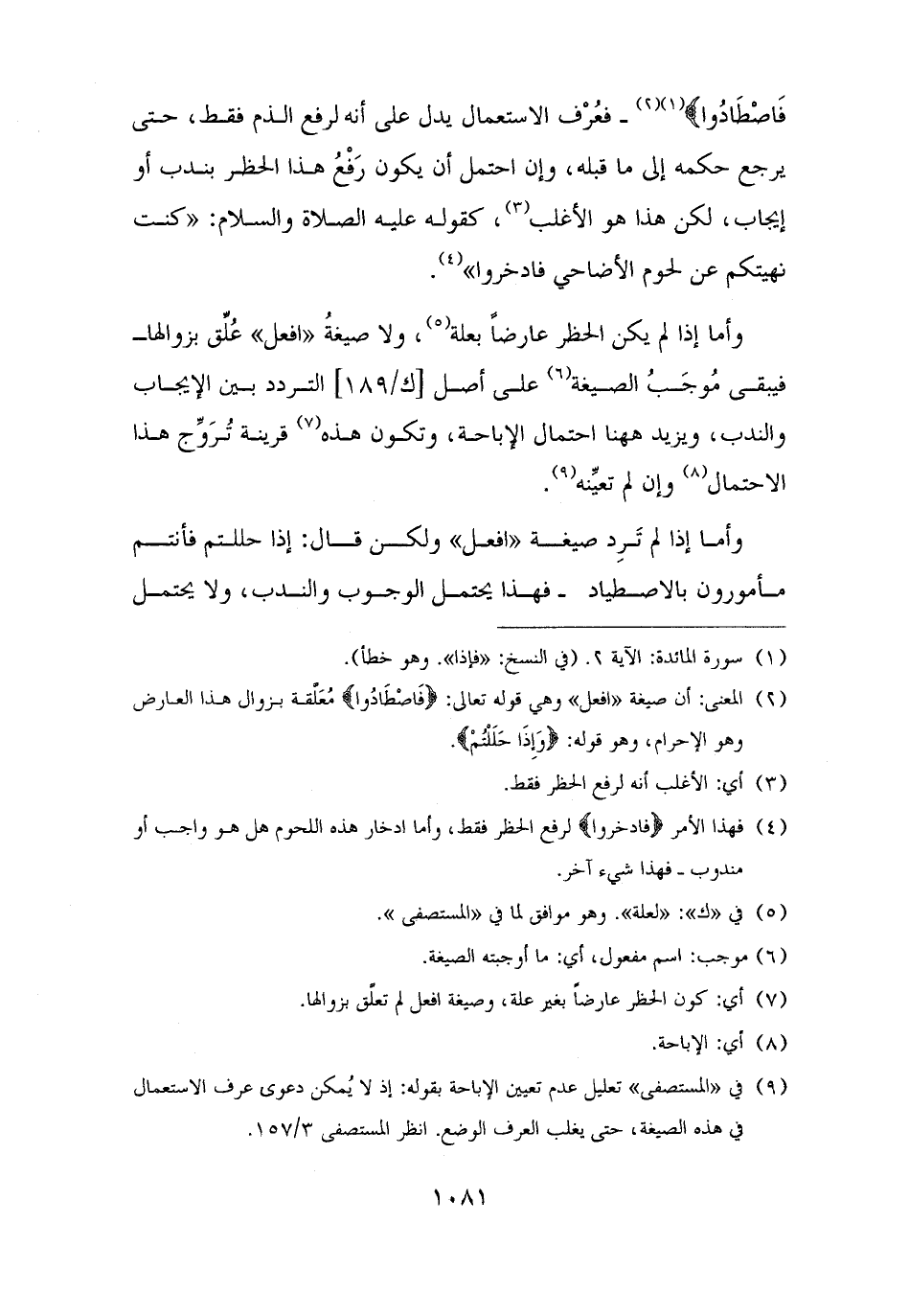 (¬٩) في "المستصفى" تعليل عدم تعيين الإباحة بقوله: إذ لا يُمكن دعوى عرف الاستعمال في هذه الصيغة، حتى يغلب العرف الوضع. انظر المستصفى ٣/ ١٥٧.