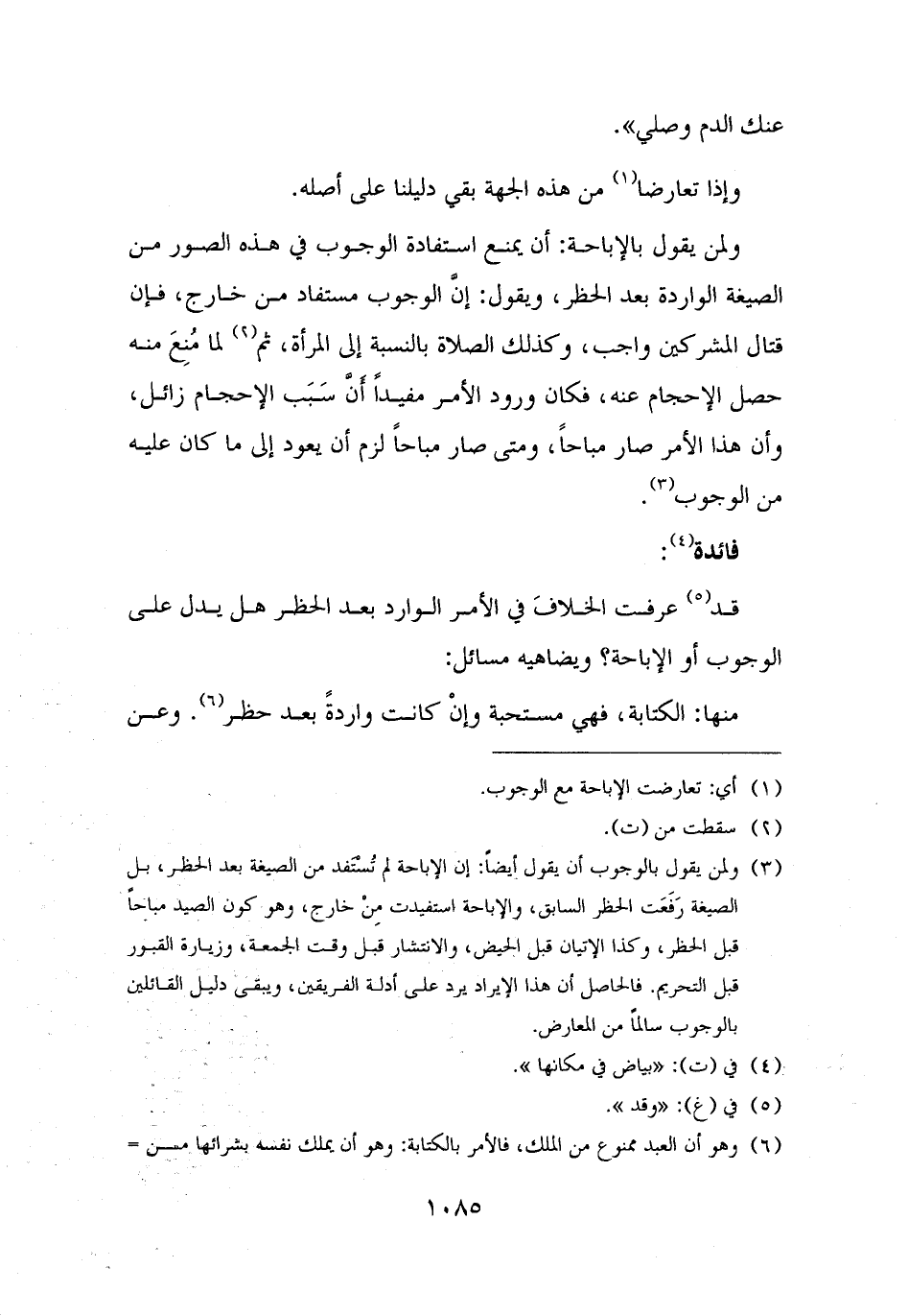 ولمن يقول بالإباحة: أن يمنع استفادة الوجوب في هذه الصور من الصيغة الواردة بعد الحظر، ويقول: إنَّ الوجوب مستفاد من خارج، فإن قتال المشركين واجب، وكذلك الصلاة بالنسبة إلى المرأة، ثم (¬٢) لما مُنِعَ منه حصل الإحجام عنه، فكان ورود الأمر مفيدًا أَنَّ سَبَب الإحجام زائل، وأن هذا الأمر صار مباحًا، ومتى صار مباحًا لزم أن يعود إلى ما كان عليه من الوجوب (¬٣).
