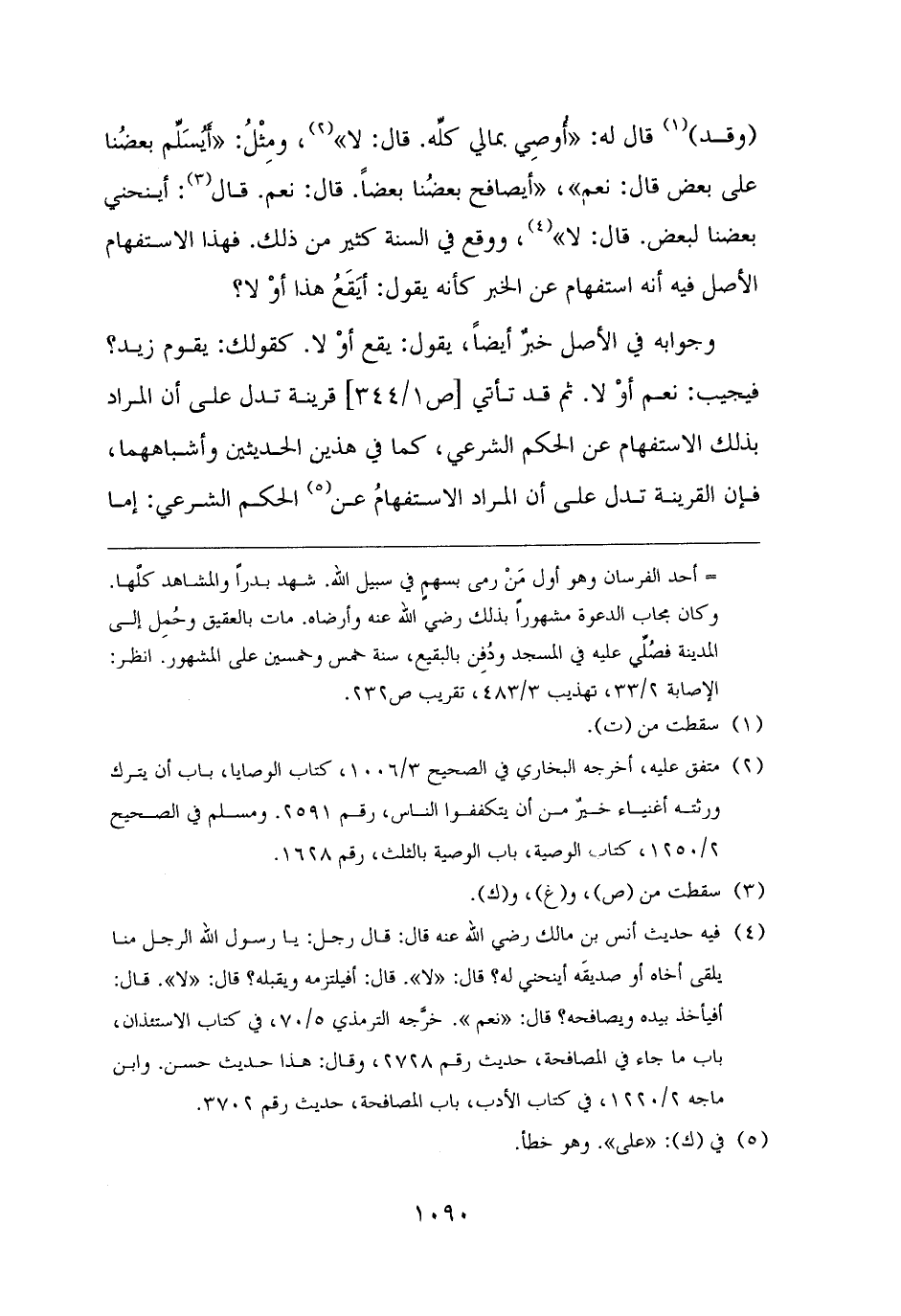 (وقد) (¬١) قال له: "أُوصِي بمالي كلِّه. قال: لا" (¬٢)، ومِثْلُ: "أَيُسَلِّم بعضُنا على بعض قال: نعم"، "أيصافح بعضُنا بعضًا. قال: نعم. قال (¬٣): أينحني بعضنا لبعض. قال: لا" (¬٤)، ووقع في السنة كثير من ذلك. فهذا الاستفهام الأصل فيه أنه استفهام عن الخبر كأنه يقول: أيَقَعُ هذا أوْ لا؟