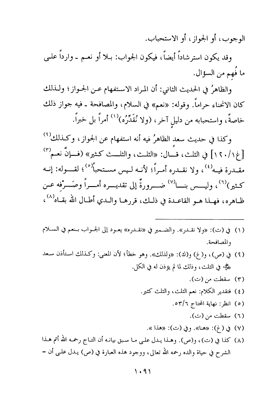 وكذا في حديث سعدٍ الظاهرُ فيه أنه استفهام عن الجواز، وكذلك (¬٢) في الثلث، قال: "الثلث، والثلث كثير" (فإنَّ نعم (¬٣) مقدرة فيه (¬٤)، ولا نقدره أمرًا؛ لأنه ليس مستحبًا (¬٥)؛ لقوله: إنه كثير) (¬٦)، وليس بنا (¬٧) ضرورةٌ إلى تقديره أمرًا وصَرْفِه عن ظاهره، فهذا هو القاعدة في ذلك، قررها والدي أطال الله بقاه (¬٨)،