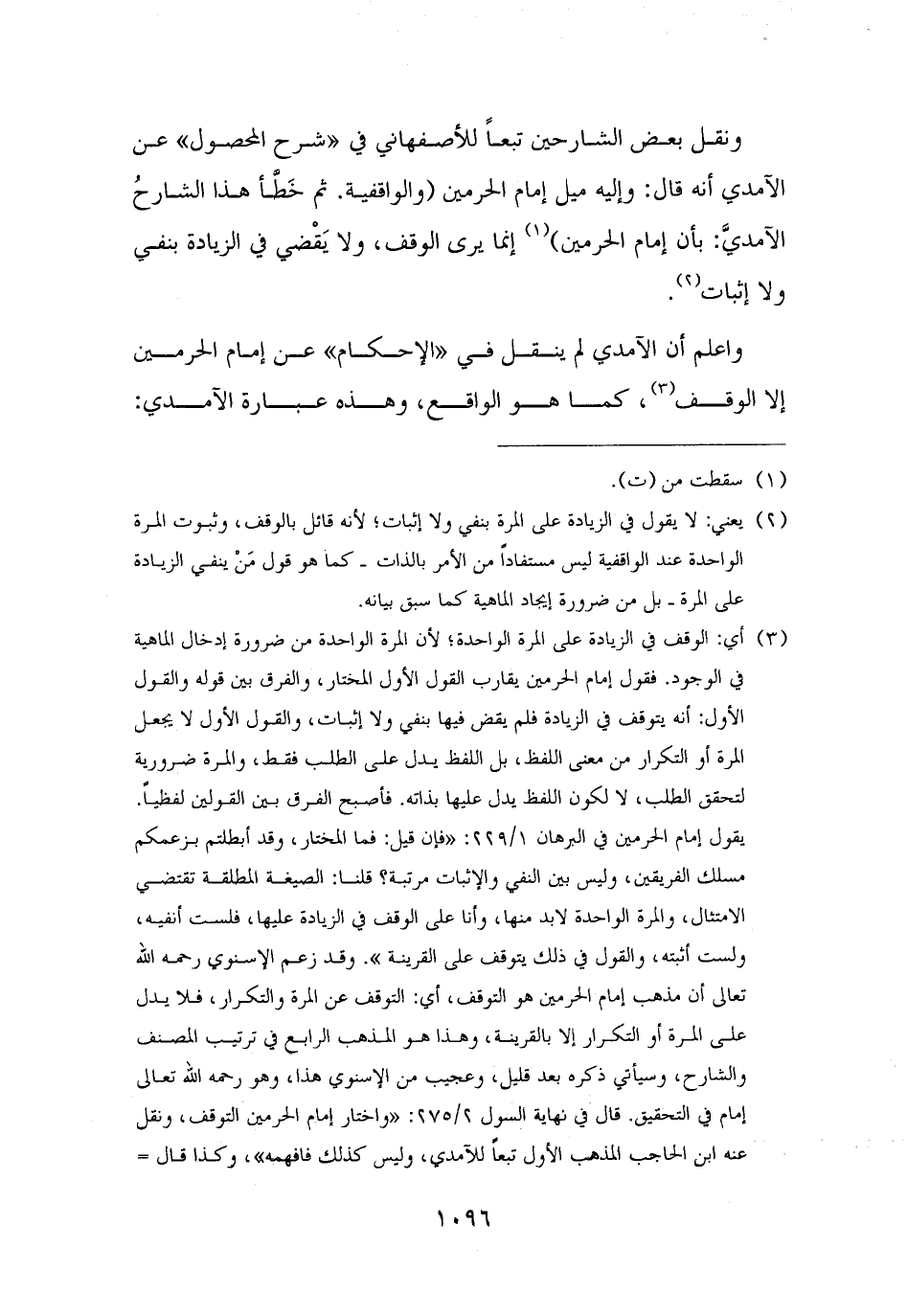 ونقل بعض الشارحين تبعًا للأصفهاني في "شرح المحصول" عن الآمدي أنه قال: وإليه ميل إمام الحرمين (والواقفية. ثم خَطَّأ هذا الشارحُ الآمديَّ: بأن إمام الحرمين) (¬١) إنما يرى الوقف، ولا يَقْضي في الزيادة بنفي ولا إثبات (¬٢).