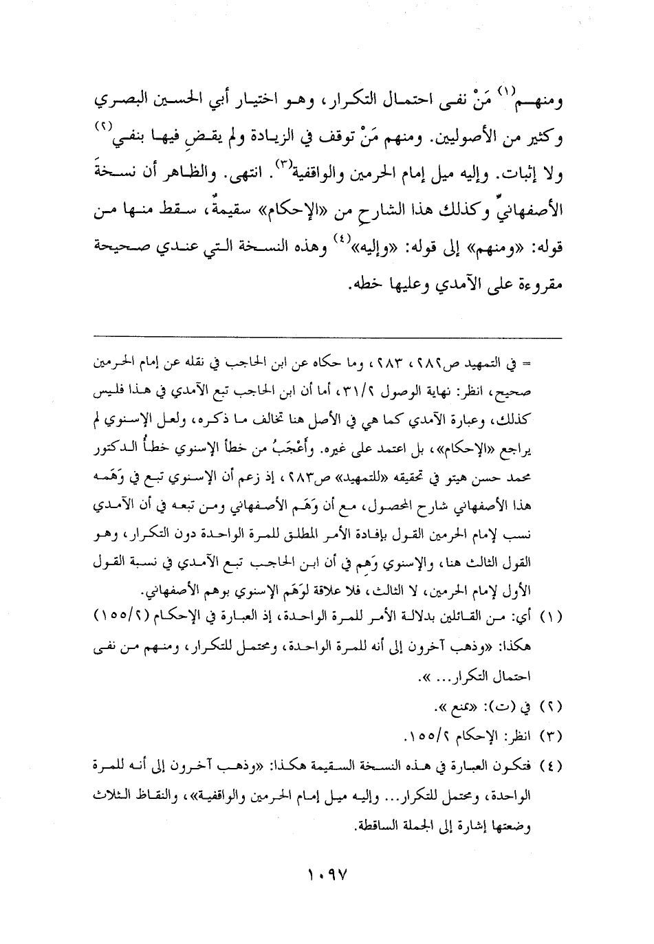(¬٤) فتكون العبارة في هذه النسخة السقيمة هكذا: "وذهب آخرون إلى أنه للمرة الواحدة، ومحتمل للتكرار. . . وإليه ميل إمام الحرمين والواقفية"، والنقاط الثلاث وضعتها إشارة إلى الجملة الساقطة.