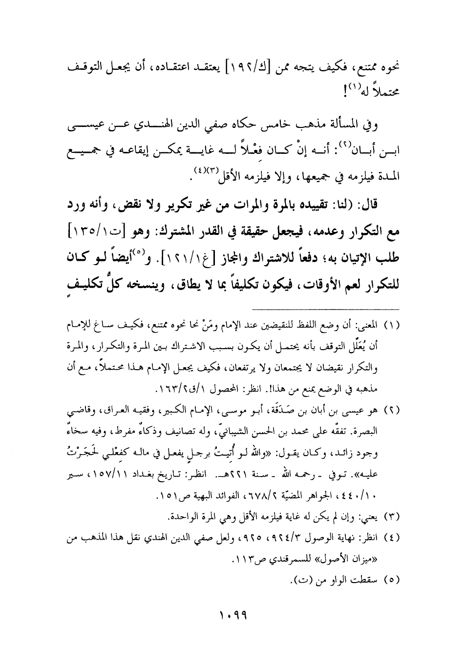 (¬٤) انظر: نهاية الوصول ٣/ ٩٢٤، ٩٢٥، ولعل صفي الدين الهندي نقل هذا المذهب من "ميزان الأصول" للسمرقندي ص ١١٣.