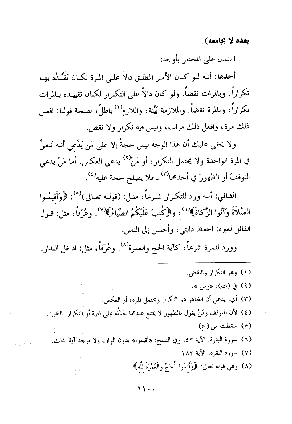 ولا يخفى عليك أن هذا الوجه ليس حجةً إلا على مَنْ يَدَّعِي أنه نَصٌّ في المرة الواحدة ولا يحتمل التكرار، أو مَنْ (¬٢) يدعى العكس. أما مَنْ يدعي التوقفَ أو الظهورَ في أحدهما (¬٣) - فلا يصلح حجة عليه (¬٤).