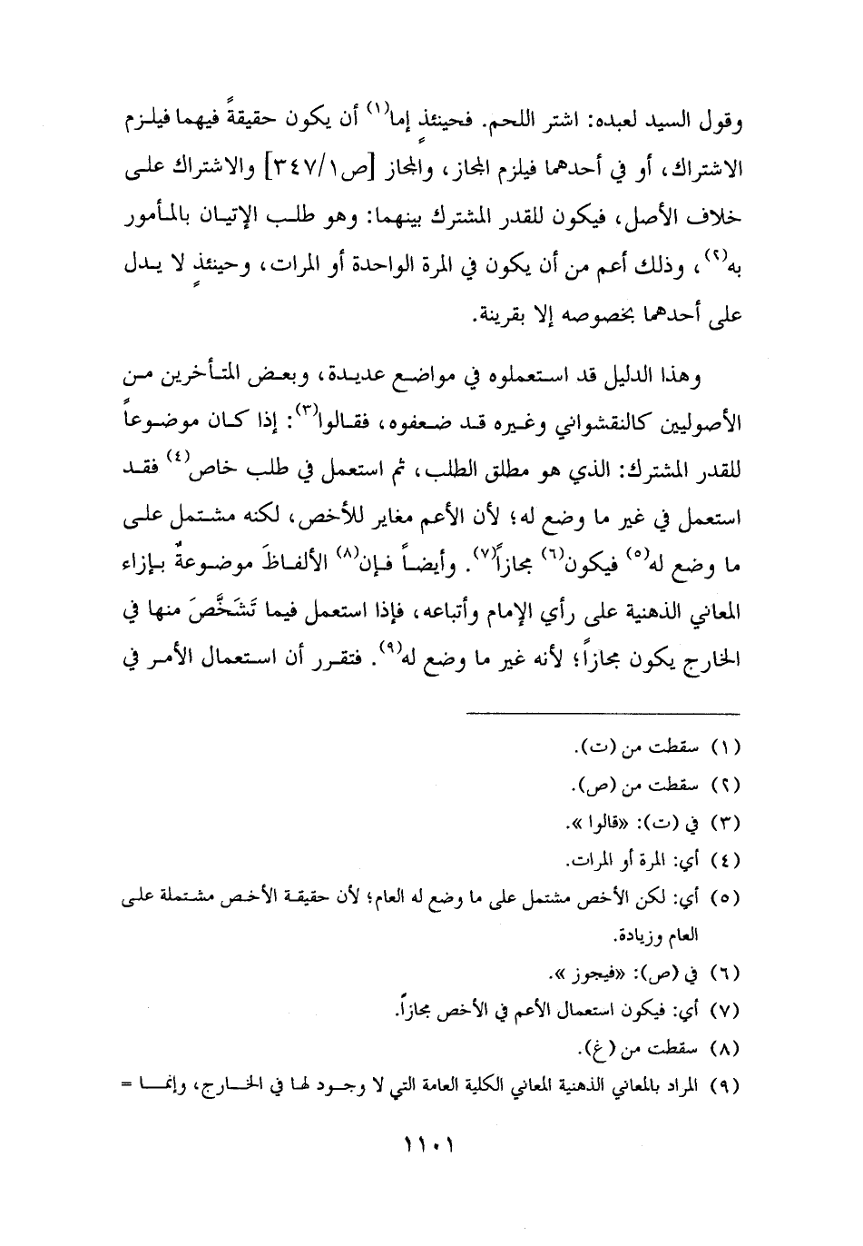 وقول السيد لعبده: اشتر اللحم. فحينئذٍ إما (¬١) أن يكون حقيقةً فيهما فيلزم الاشتراك، أو في أحدهما فيلزم المجاز، والمجاز والاشتراك على خلاف الأصل، فيكون للقدر المشترك بينهما: وهو طلب الإتيان بالمأمور به (¬٢)، وذلك أعم من أن يكون في المرة الواحدة أو المرات، وحينئذٍ لا يدل على أحدهما بخصوصه إلا بقرينة.