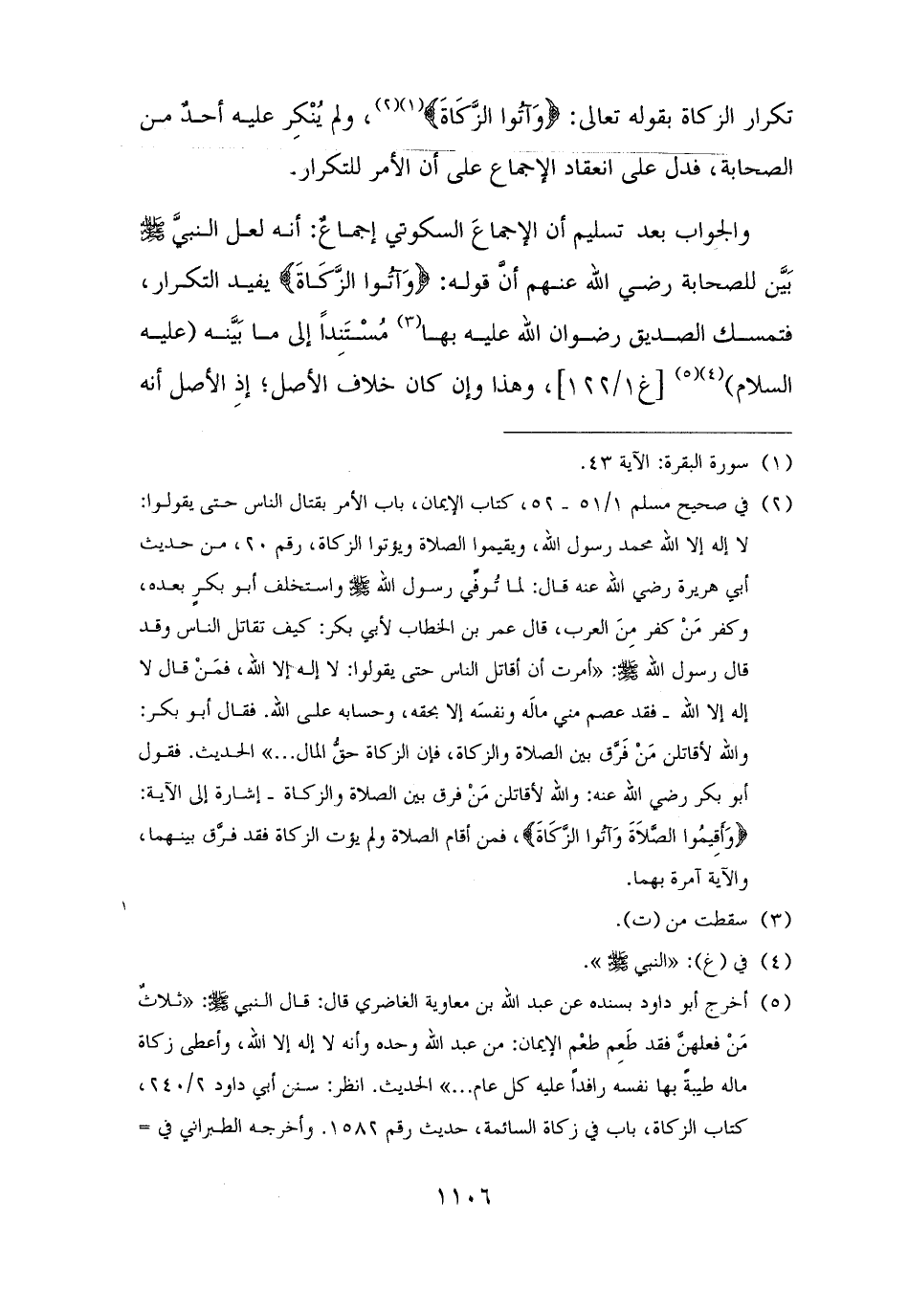 والجواب بعد تسليم أن الإجماعَ السكوتي إجماعٌ: أنه لعل النبيَّ - صلى الله عليه وسلم - بَيَّن للصحابة رضي الله عنهم أنَّ قوله: {وَآتُوا الزَّكَاةَ} يفيد التكرار، فتمسك الصديق رضوان الله عليه بها (¬٣) مُسْتَنِدًا إلى ما بَيَّنه (عليه السلام) (¬٤) (¬٥)، وهذا وإن كان خلاف الأصل؛ إذِ الأصل أنه