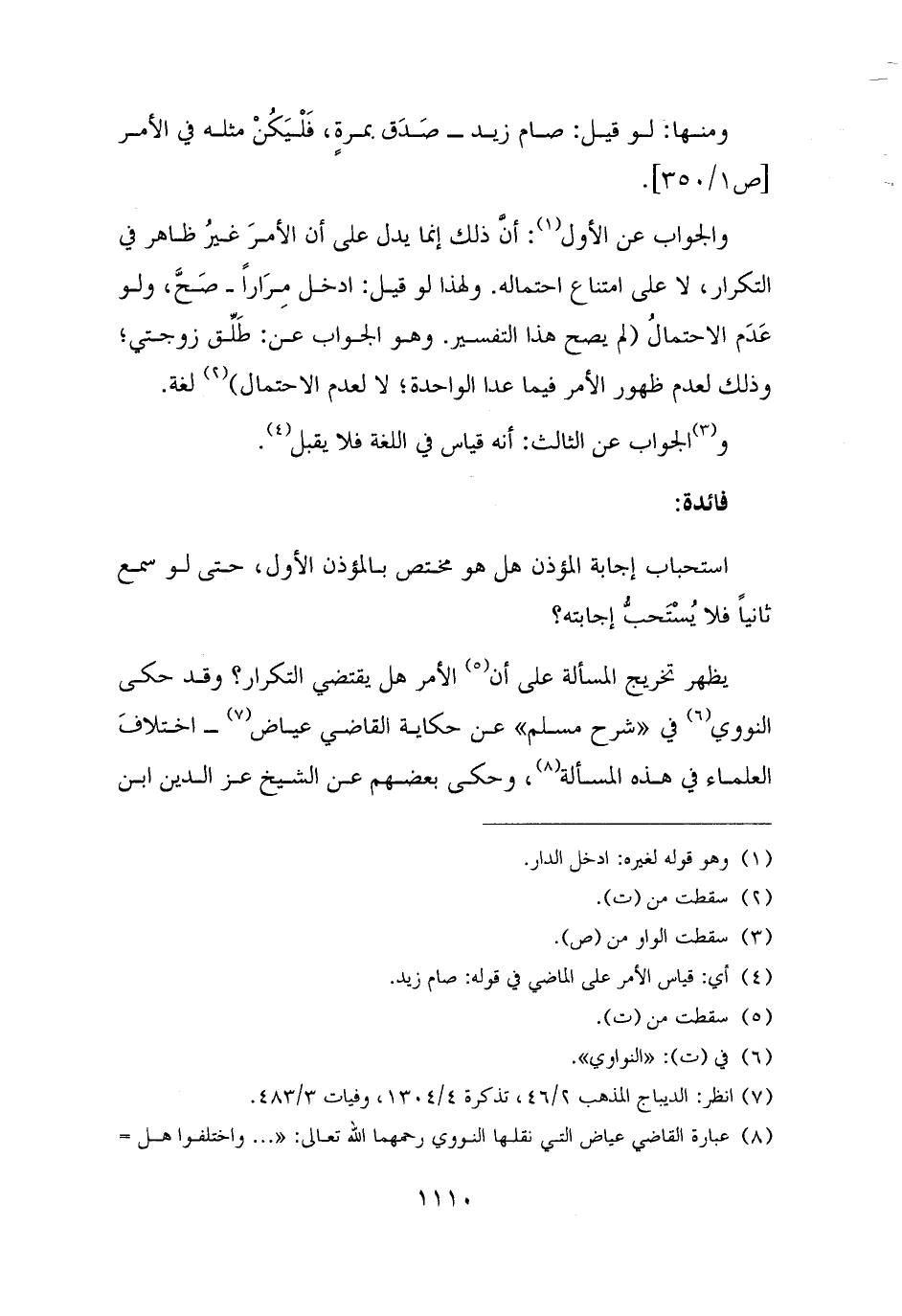 والجواب عن الأول (¬١): أنَّ ذلك إنما يدل على أن الأمرَ غيرُ ظاهر في التكرار، لا على امتناع احتماله. ولهذا لو قيل: ادخل مِرَارًا - صَحَّ، ولو عَدَم الاحتمالُ (لم يصح هذا التفسير. وهو الجواب عن: طَلِّق زوجتي؛ وذلك لعدم ظهور الأمر فيما عدا الواحدة؛ لا لعدم الاحتمال) (¬٢) لغة.
