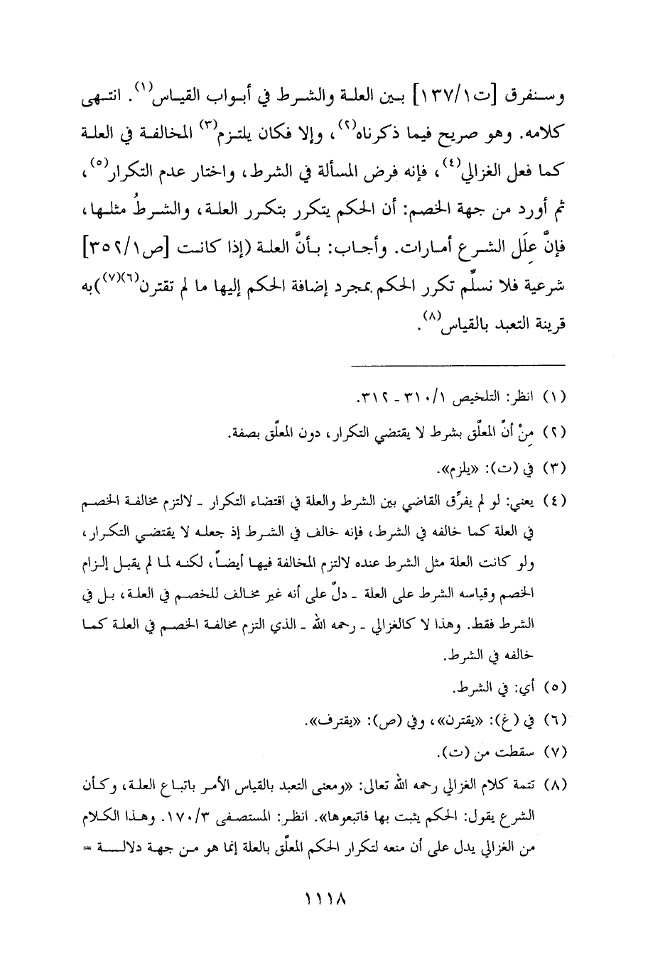 (¬٤) يعني: لو لم يفرِّق القاضي بين الشرط والعلة في اقتضاء التكرار - لالتزم مخالفة الخصم في العلة كما خالفه في الشرط، فإنه خالف في الشرط إذ جعله لا يقتضي التكرار، ولو كانت العلة مثل الشرط عنده لالتزم المخالفة فيها أيضًا، لكنه لما لم يقبل إلزام الخصم وقياسه الشرط على العلة - دلَّ على أنه غير مخالف للخصم في العلة، بل في الشرط فقط. وهذا لا كالغزالي - رحمه الله - الذي التزم مخالفة الخصم في العلة كما خالفه في الشرط.
