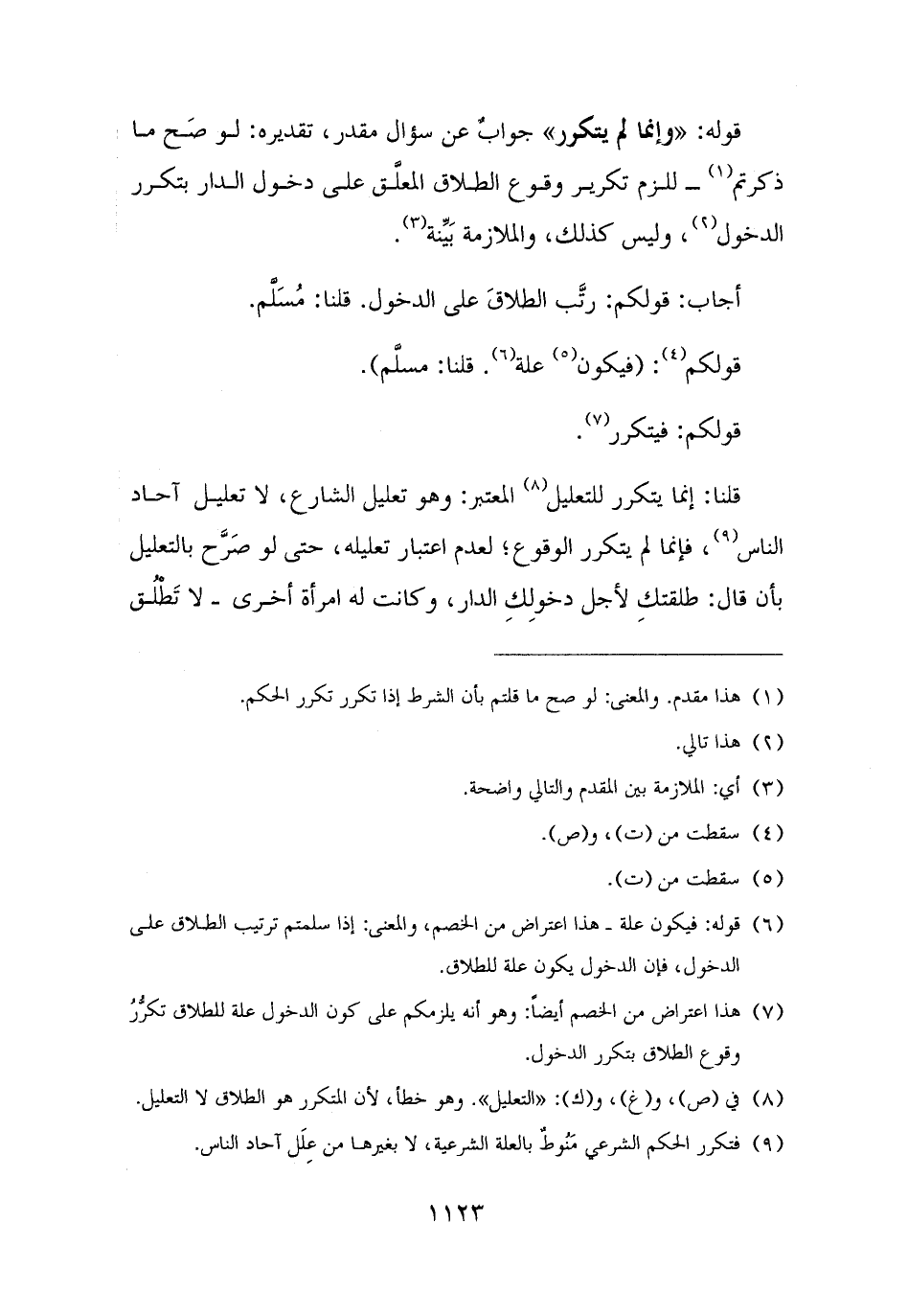 (¬٨) في (ص)، و (غ)، و (ك): "التعليل". وهو خطأ، لأن المتكرر هو الطلاق لا التعليل.