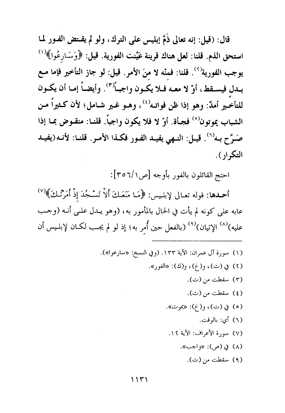 قال: (قيل: إنه تعالى ذَمَّ إبليس على الترك، ولو لم يقتض الفور لما استحق الذم. قلنا: لعل هناك قرينة عَيَّنت الفورية. قيل: {وَسَارِعُوا} (¬١) يوجب الفورية (¬٢). قلنا: فمِنْه لا مِنَ الأمر. قيل: لو جاز التأخير فإما مع بدلٍ فيسقط، أوْ لا معه فلا يكون واجبًا (¬٣). وأيضًا إما أن يكون للتأخير أمدٌ: وهو إذا ظن فواته (¬٤)، وهو غير شامل؛ لأن كثيرًا من الشباب يموتون (¬٥) فجأة. أوْ لا فلا يكون واجبًا. قلنا: منقوض بما إذا صَرَّح به (¬٦). قيل: النهي يفيد الفور فكذا الأمر. قلنا: لأنه (يفيد التكرار).