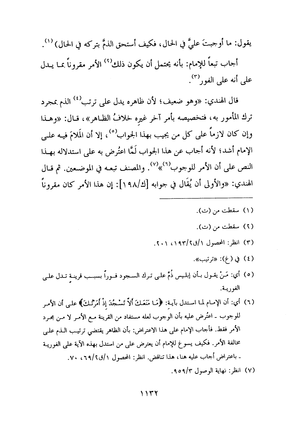 (¬٦) أي: أن الإمام لما استدل بآيةِ: {مَا مَنَعَكَ أَلَّا تَسْجُدَ إِذْ أَمَرْتُكَ} على أن الأمر للوجوب - اعتُرض عليه بأن الوجوب لعله مستفاد من القرينة مع الأمر لا من مجرد الأمر فقط. فأجاب الإمام على هذا الاعتراض: بأن الظاهر يقتضي ترتيب الذم على مخالفة الأمر. فكيف يسوغ للإمام أن يعترض على من استدل بهذه الآية على الفورية - باعتراض أجاب عليه هنا، هذا تناقض. انظر: المحصول ١ / ق ٢/ ٦٩، ٧٠.
