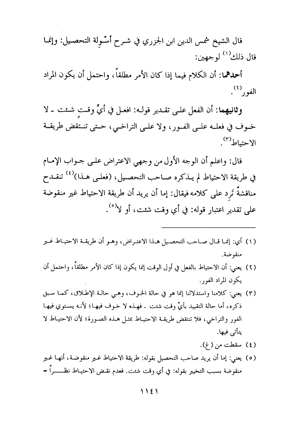 (¬٣) يعني: كلامنا واستدلالنا إنما هو في حالة الخوف، وهي حالة الإطلاق، كما سبق ذكره، أما حالة التقييد بأيِّ وقت شئت - فهذه لا خوف فيها؛ لأنه يستوي فيها الفور والتراخي، فلا تنتقض طريقة الاحتياط بمثل هذه الصورة؛ لأن الاحتياط لا يتأتى فيها.