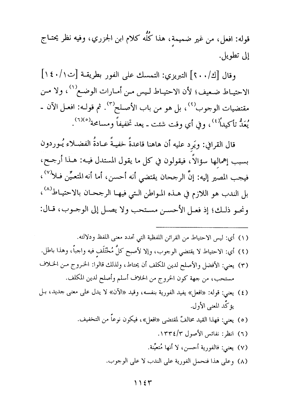 وقال التبريزي: التمسك على الفور بطريقة الاحتياط ضعيف؛ لأن الاحتياط ليس من أمارات الوضع (¬١)، ولا من مقتضيات الوجوب (¬٢)، بل هو من باب الأصلح (¬٣). ثم قوله: افعل الآن - يُعَدُّ تأكيدًا (¬٤)، وفي أي وقت شئت - يعد تخفيفًا ومسامحة (¬٥) (¬٦).