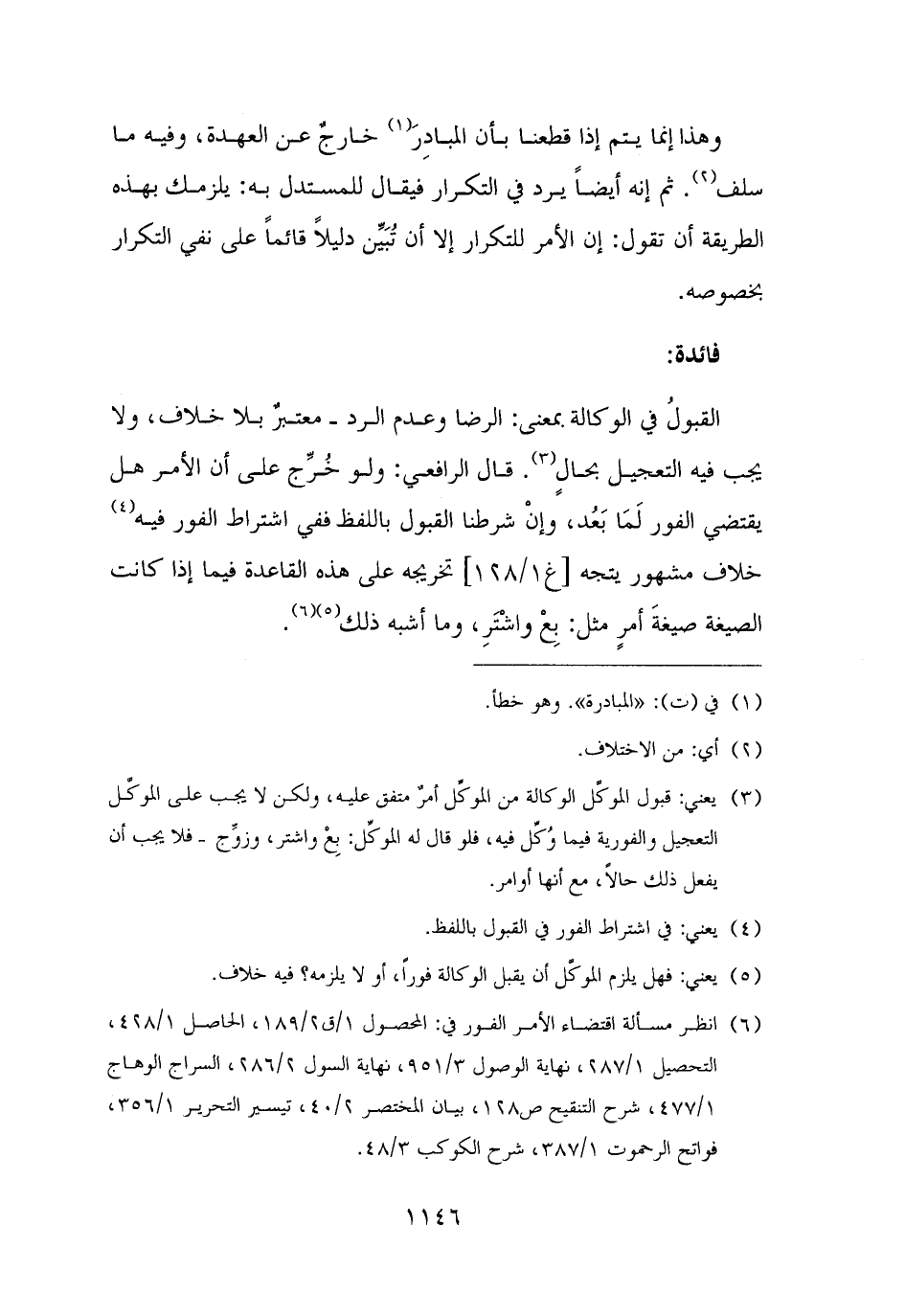 (¬٥) يعني: فهل يلزم الموكَّل أن يقبل الوكالة فورًا، أو لا يلزمه؟ فيه خلاف.